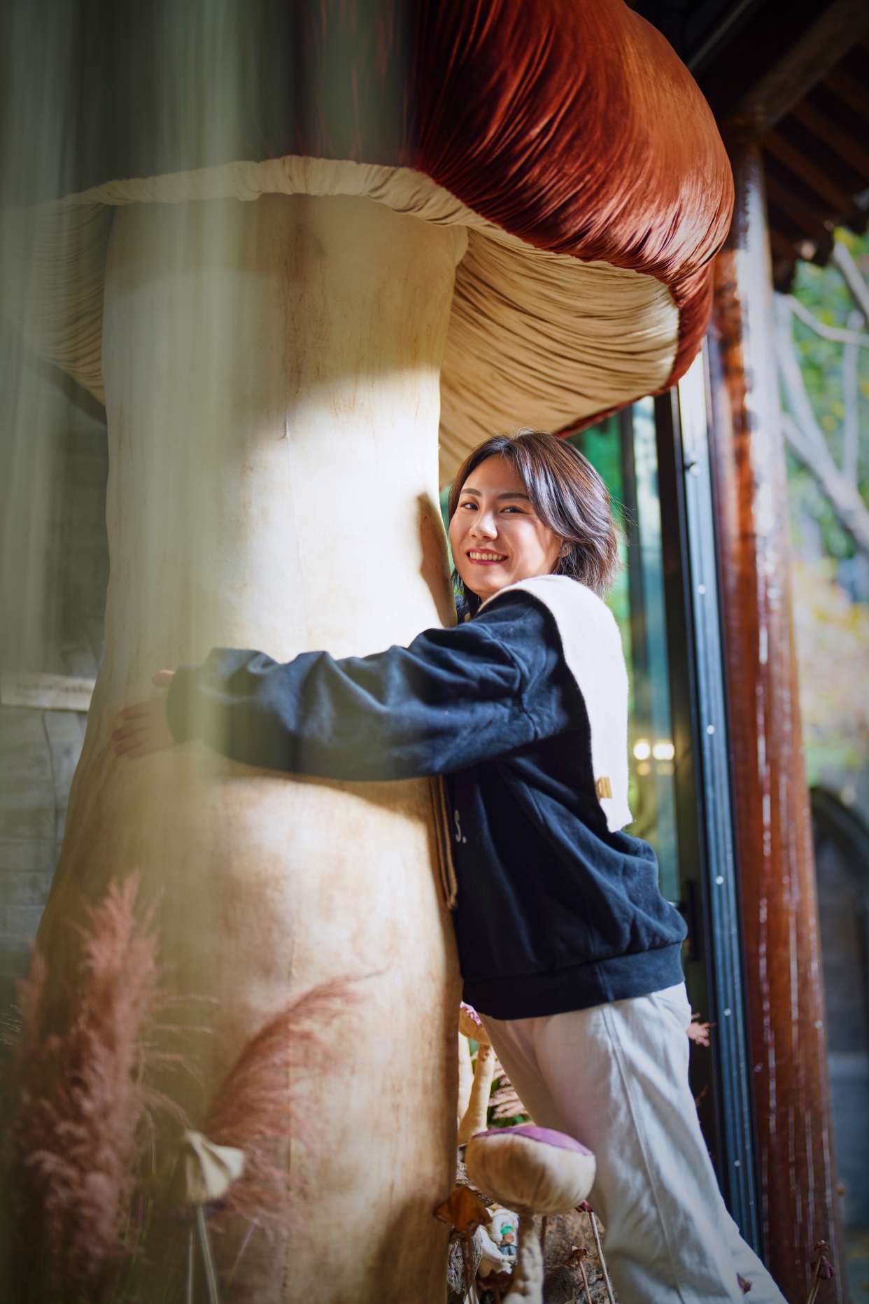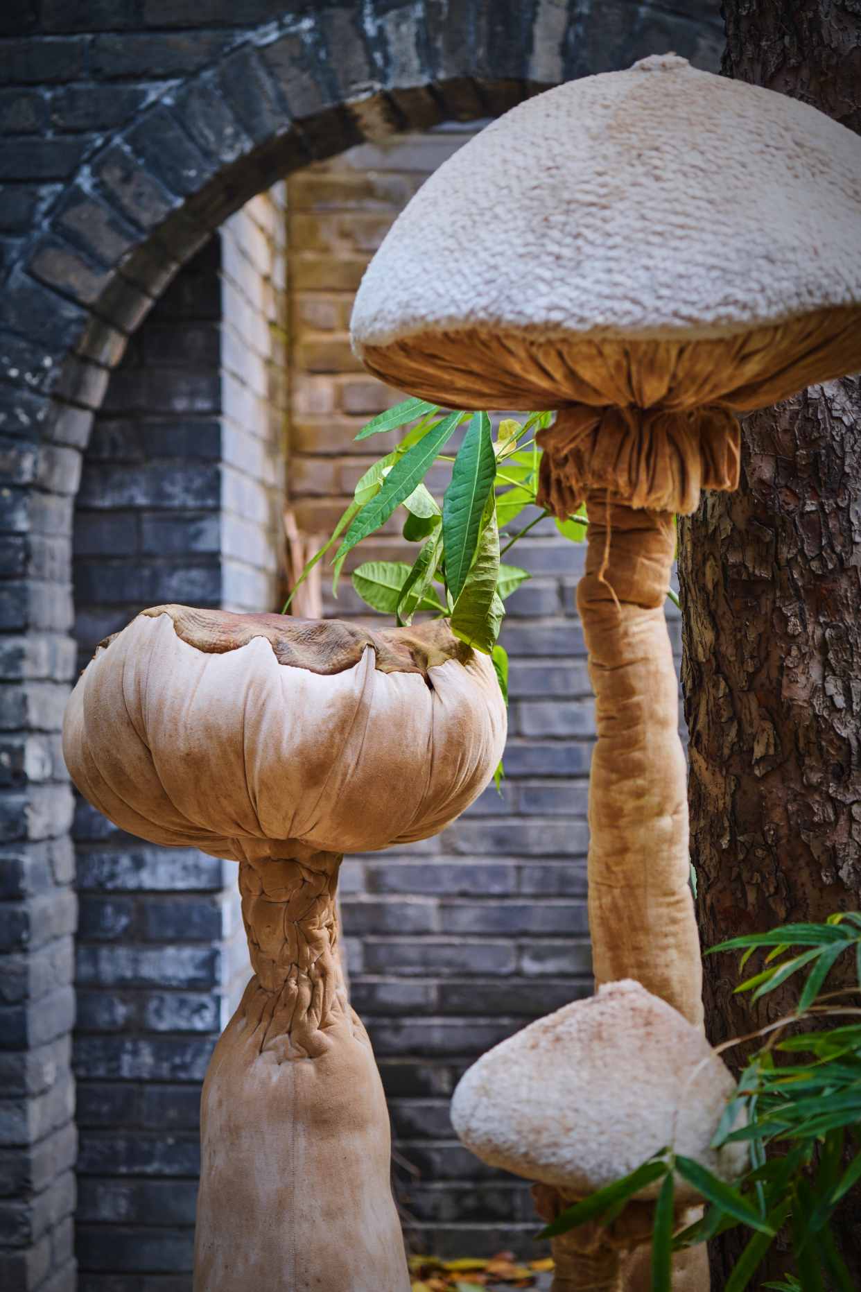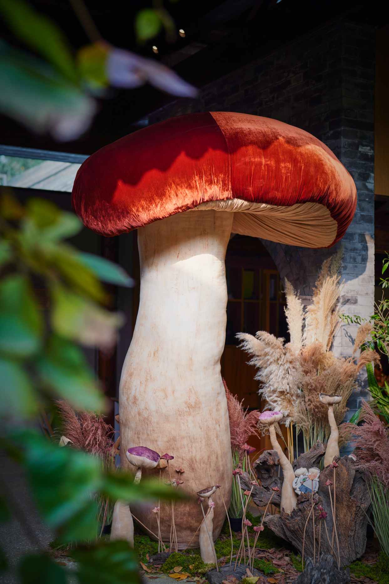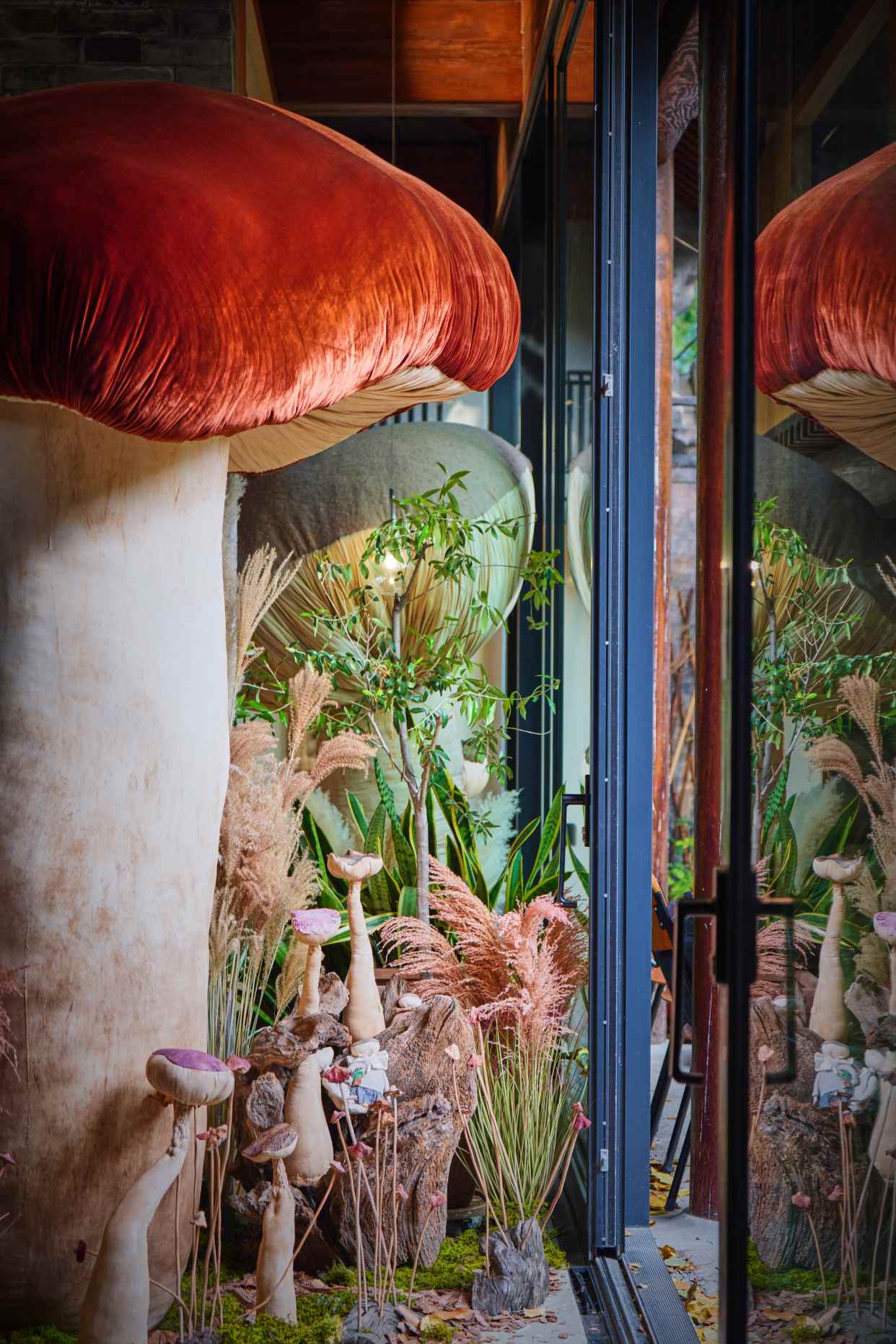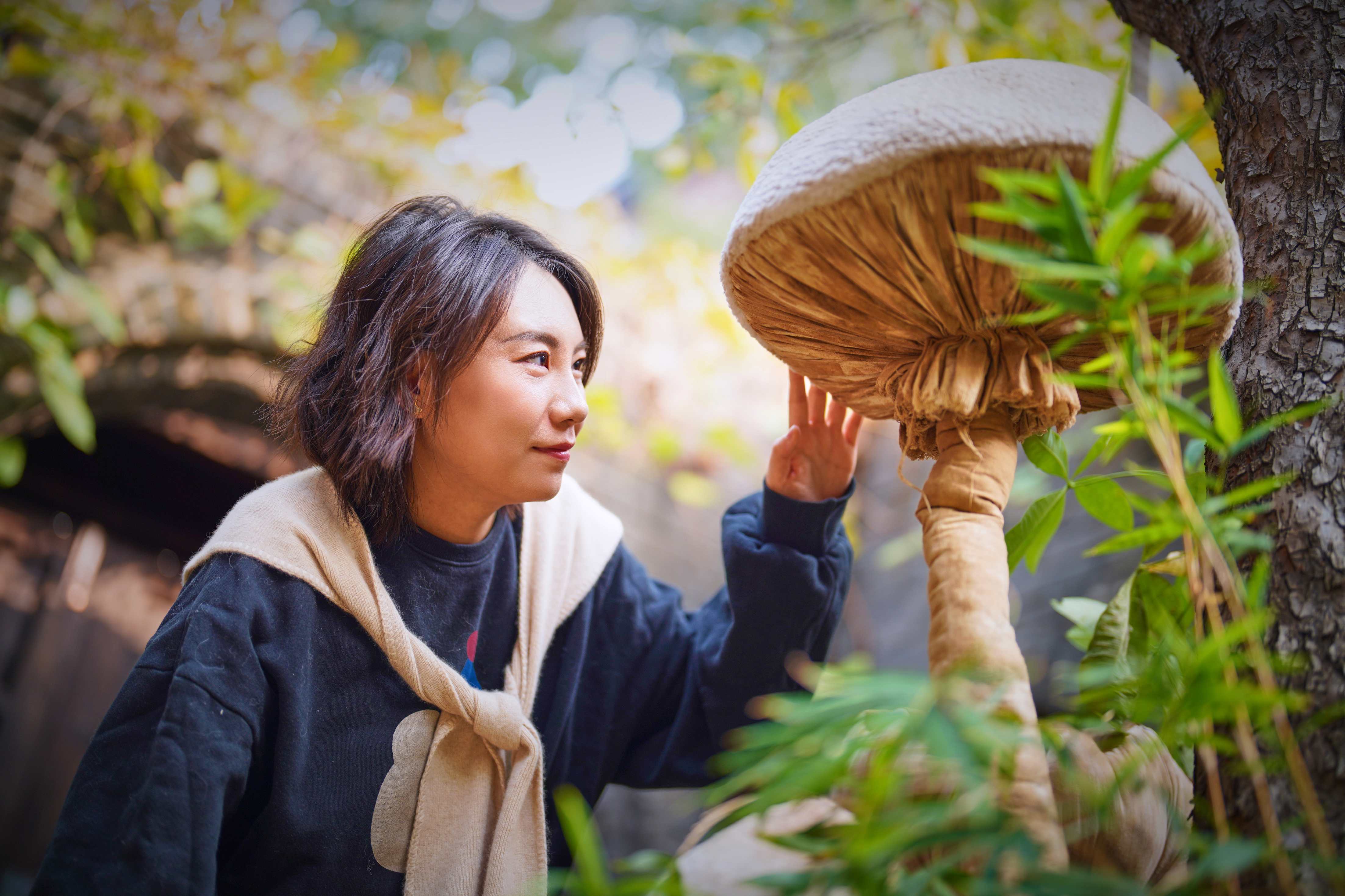大大小小的蘑菇丛丛簇簇,依偎在海棠树下、停驻在房梁木上、静立在落地窗边……构筑出一个童话般的“共生”世界。