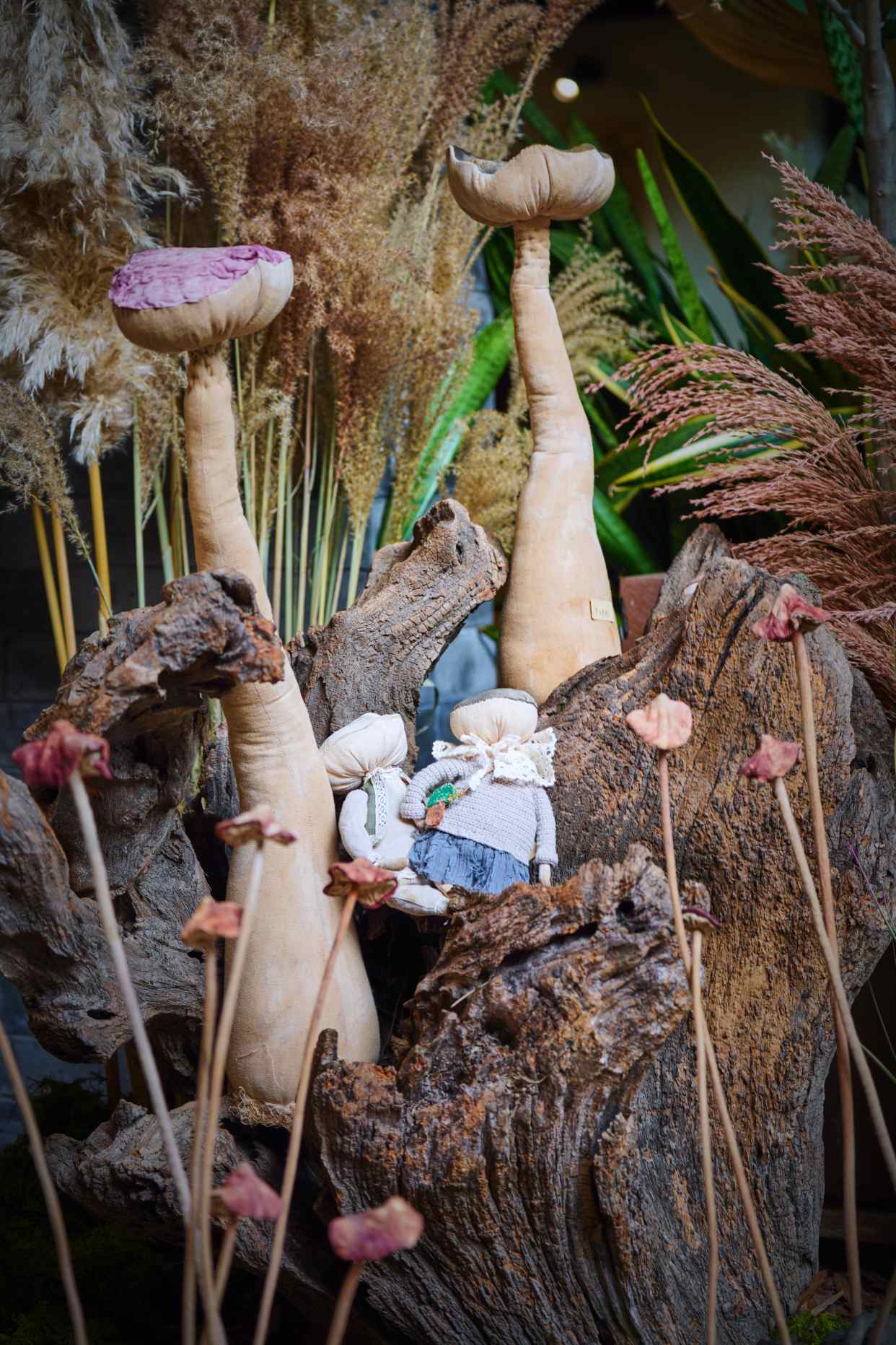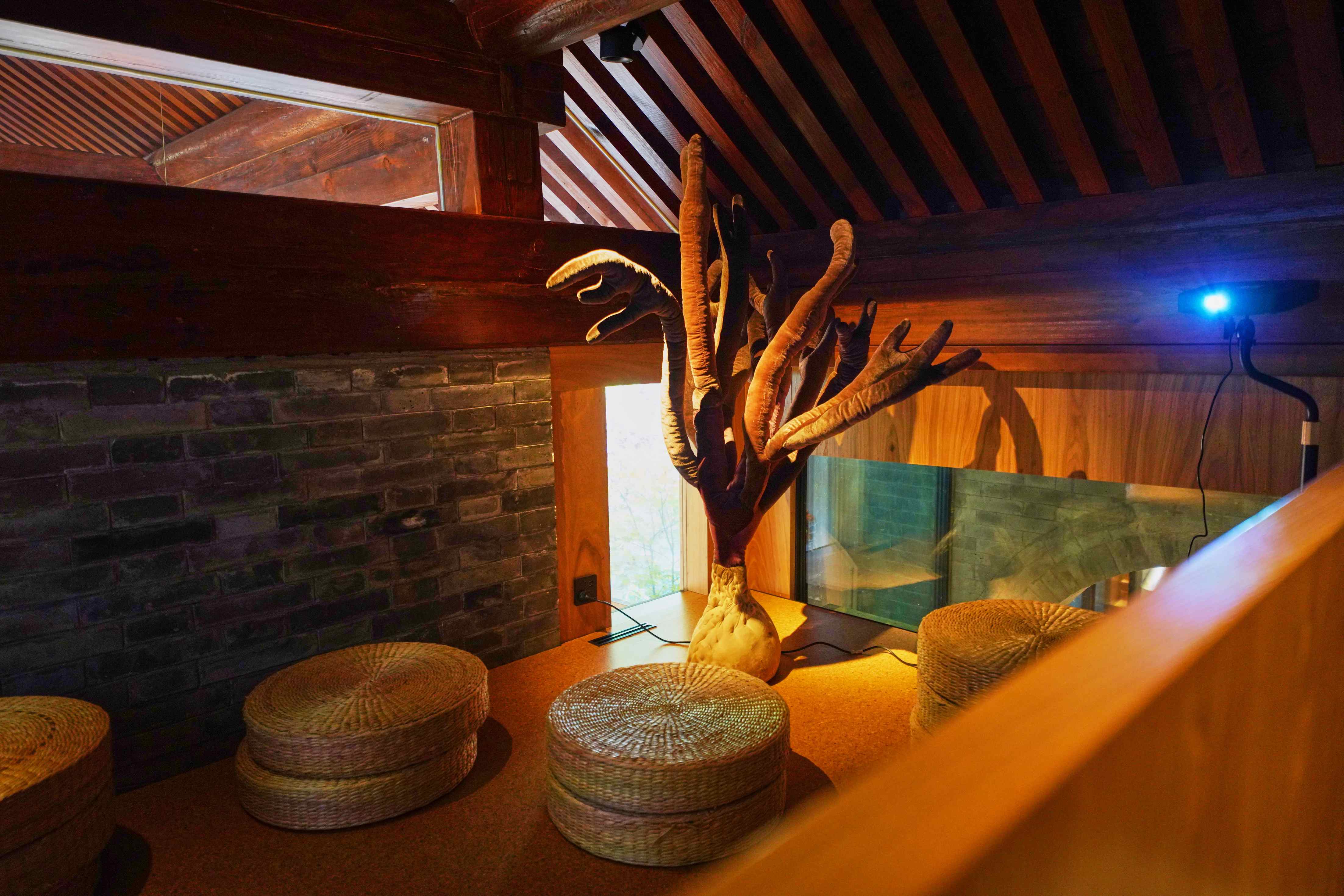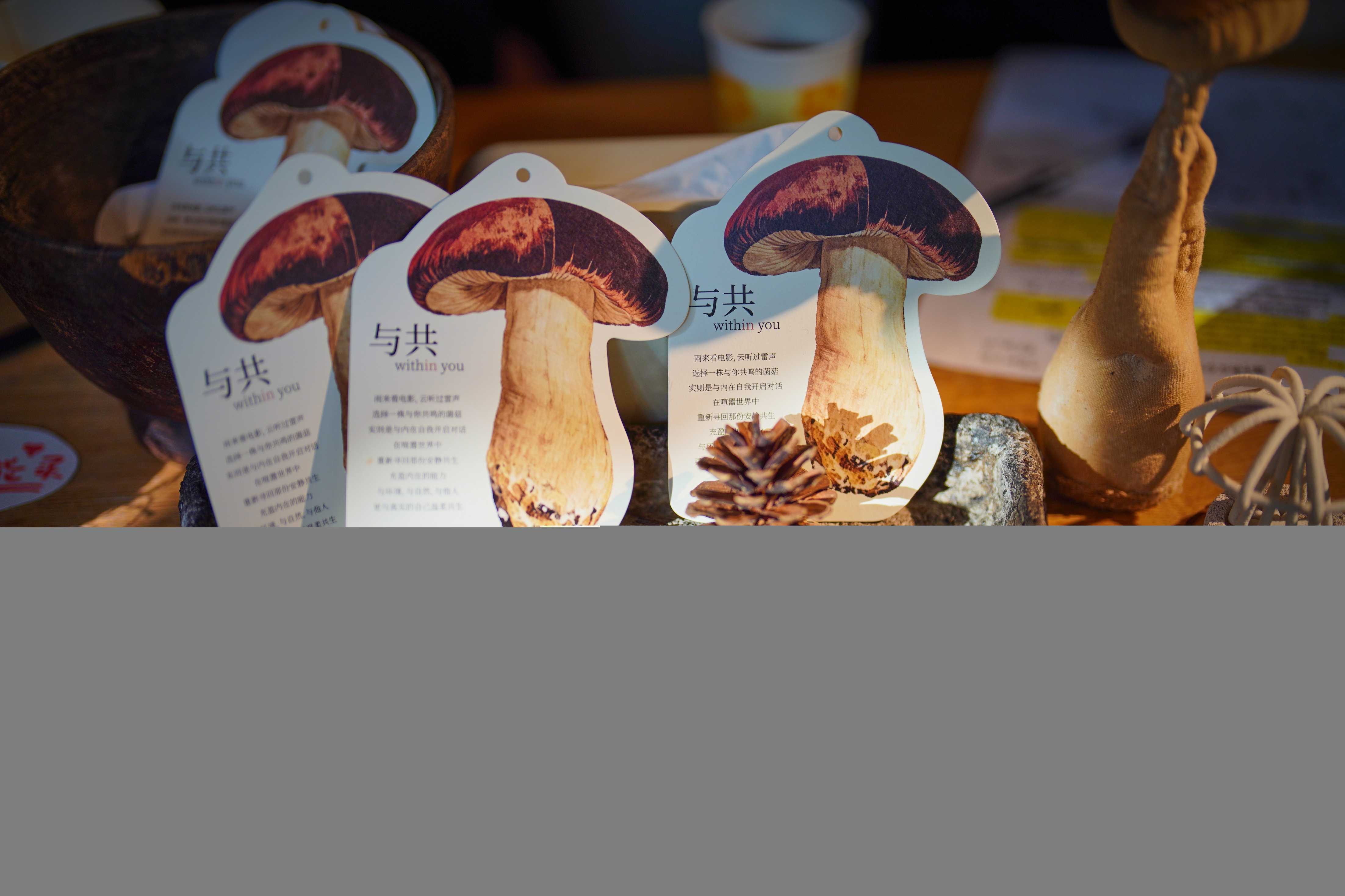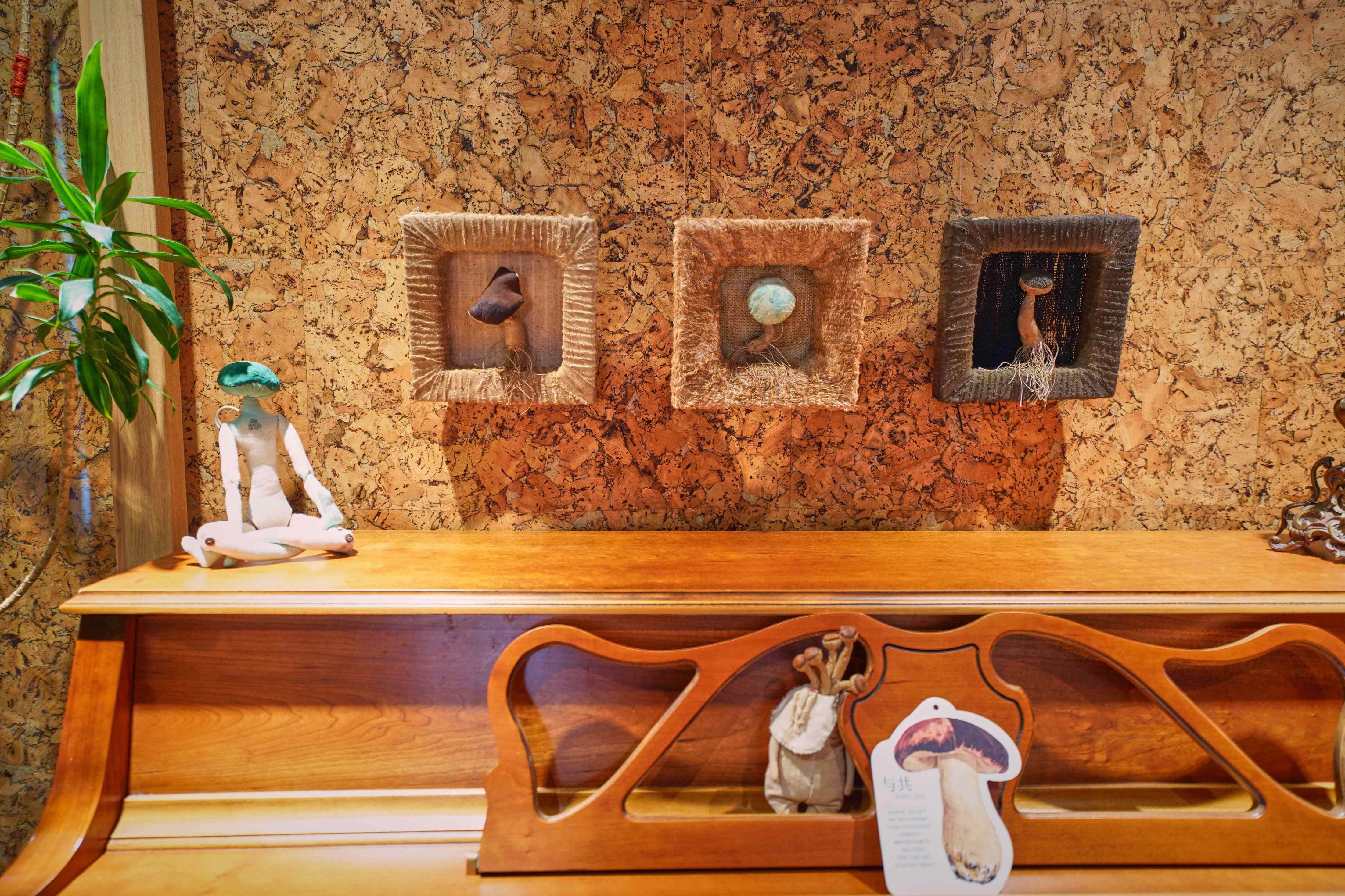 这里有两米多高的巨型菌菇,也有手指大小的几株被嵌入画框,像会呼吸的标本画。