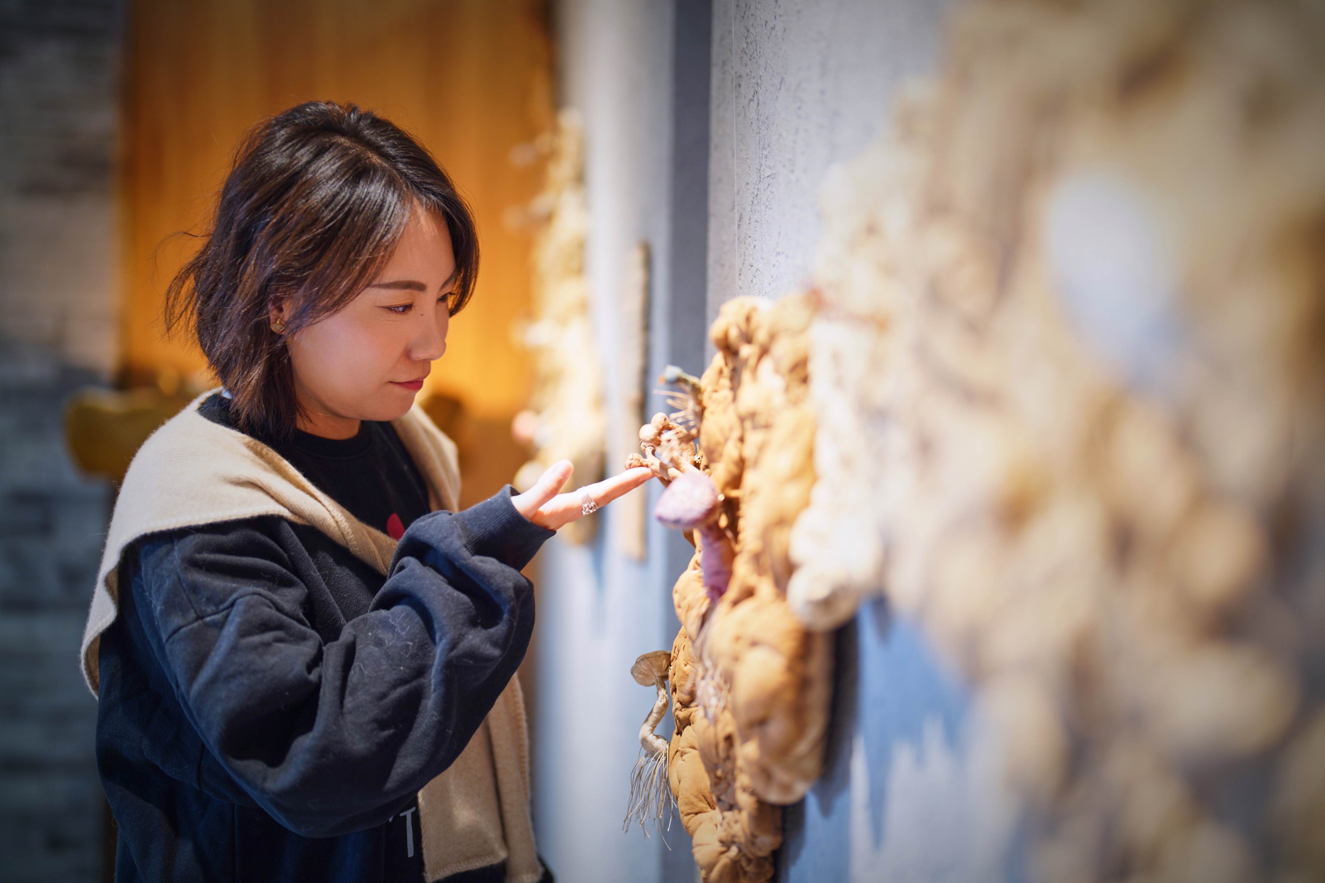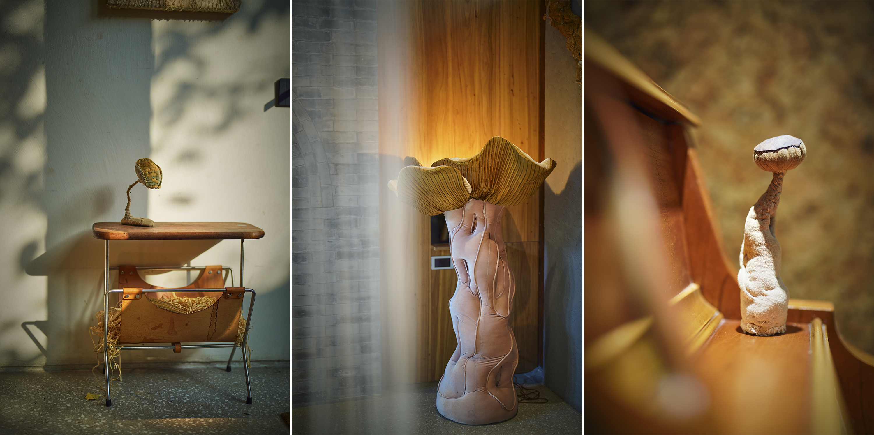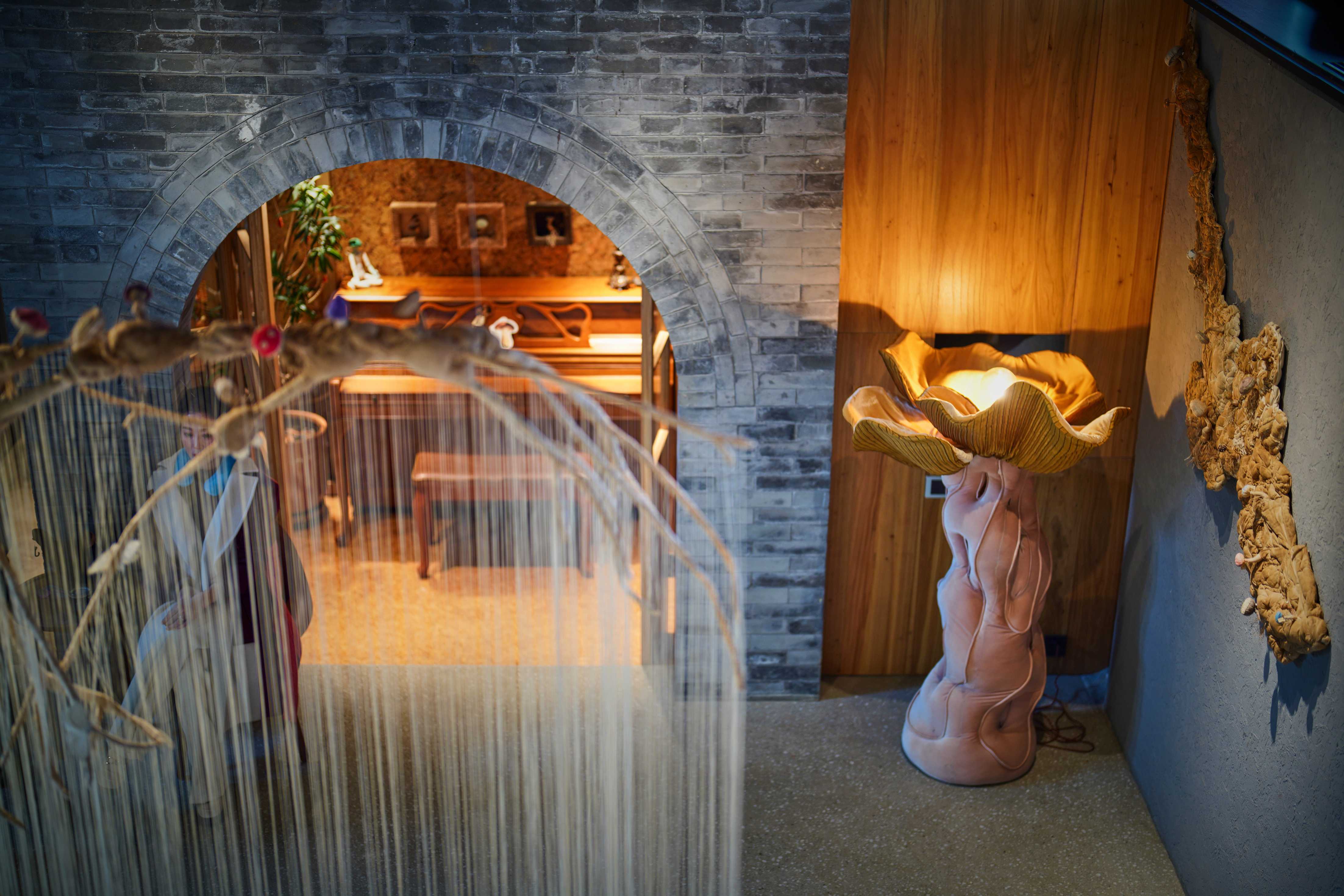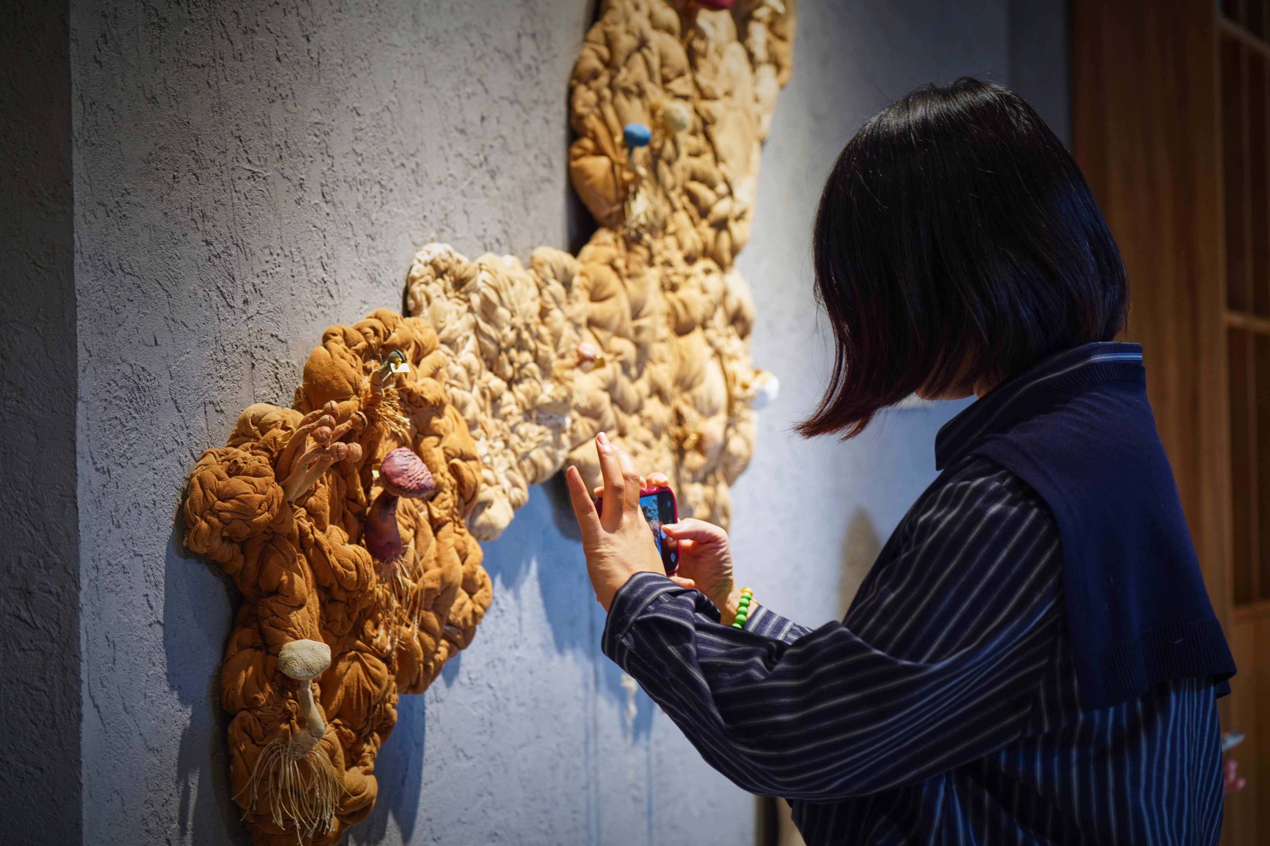 艺术家以棉布、丝绒、羊皮等天然材质,借精湛手工勾勒出菌菇与万物默契共生的画面,唤起观众重新思考人与自然、与社会之间的深层联结。
