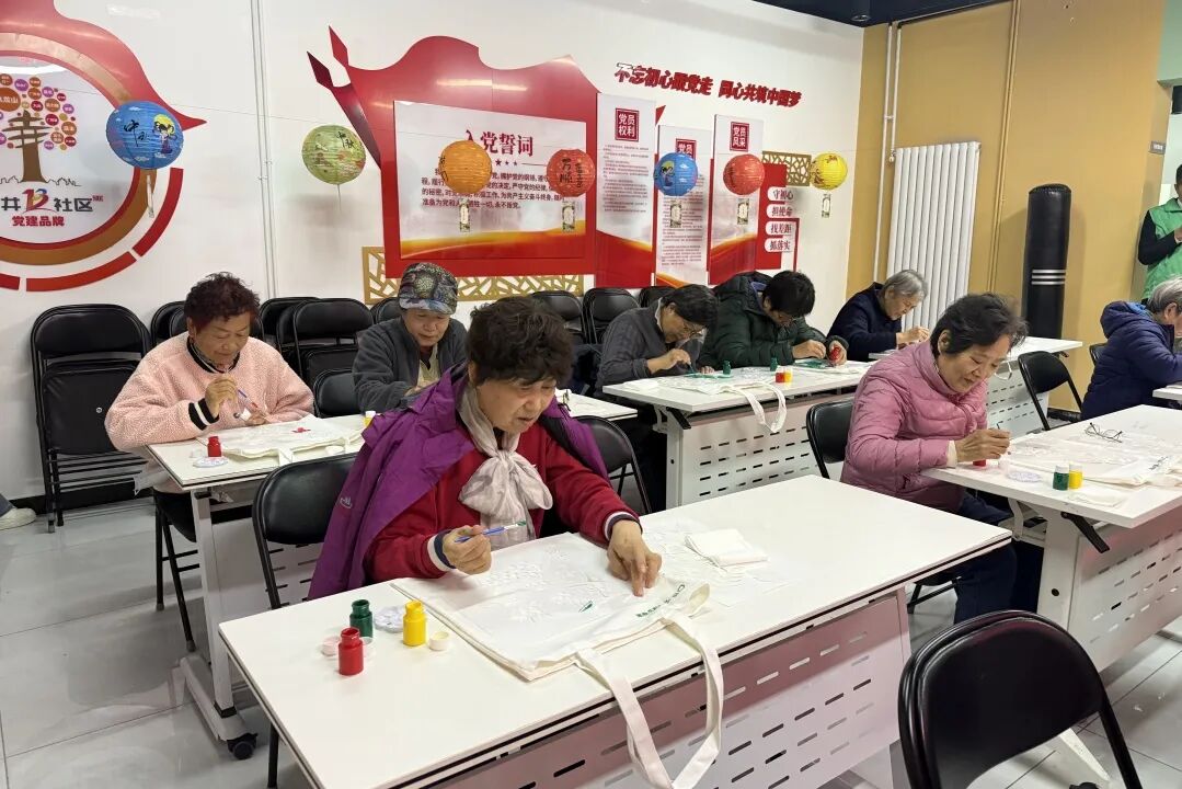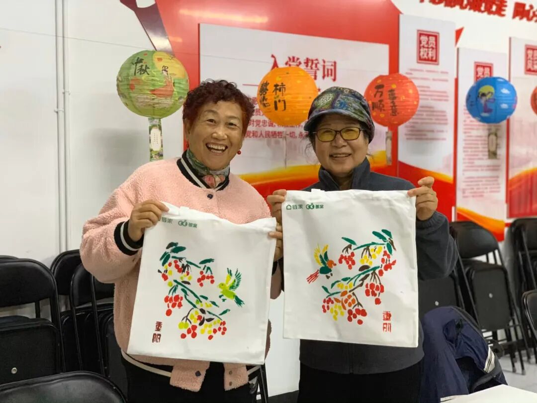 活动现场,有的人指尖蘸取暖红与明黄,让果枝在布袋上绽出沉甸甸的秋实感;有的人偏爱浅绿与棕橙的碰撞,让飞鸟仿佛从橙黄的秋叶间掠过,就连“重阳”二字的标识,也被不同的笔触晕染出层次,个人都把独属自己的秋日记忆,糅进了布袋的纹路里。