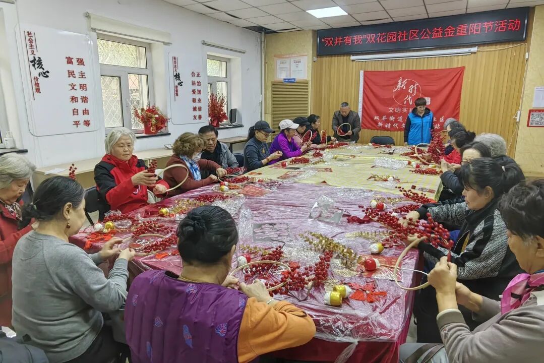 在重阳节来临之际,双花园社区以“巧手制花环,邻里话温情”为主题,开展重阳节花环制作活动,为辖区长辈们送上一份充满心意的节日体验。