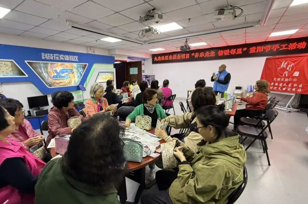 参与居民围坐成圈彼此搭手、默契协作,年过七旬的阿姨眼神稍弱,身旁的主动帮她理线、比对裁剪标记,“加片银杏叶贴合秋日”,制作心得在欢声笑语中流转。经过近两小时的专注创作,一个个兼具美观与实用性的手工包新鲜出炉,居民们捧着亲手制作的作品拍照留念,脸上满是成就感。
