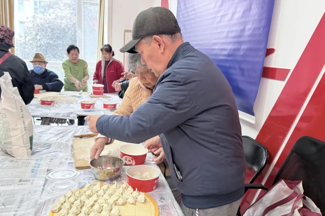 居民们熟稔地揉着面团,指尖下压、旋转间,面团很快被擀成薄厚均匀的饺子皮,“擀皮要转着圈擀,边缘薄中间厚,煮的时候不容易破。”几位居民围坐包馅,有人捏出精巧的月牙褶,有人包成饱满的元宝形,遇到手法生疏的,身旁邻居立刻示范:“捏的时候拇指和食指要配合着往上提,这样褶子才好看。”社区工作人员则穿梭其间,帮着添馅料、递工具,还时不时拍下大家协作的温馨瞬间。
