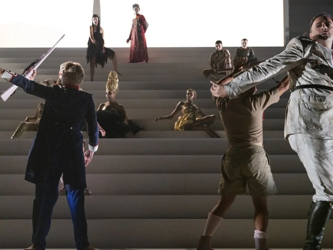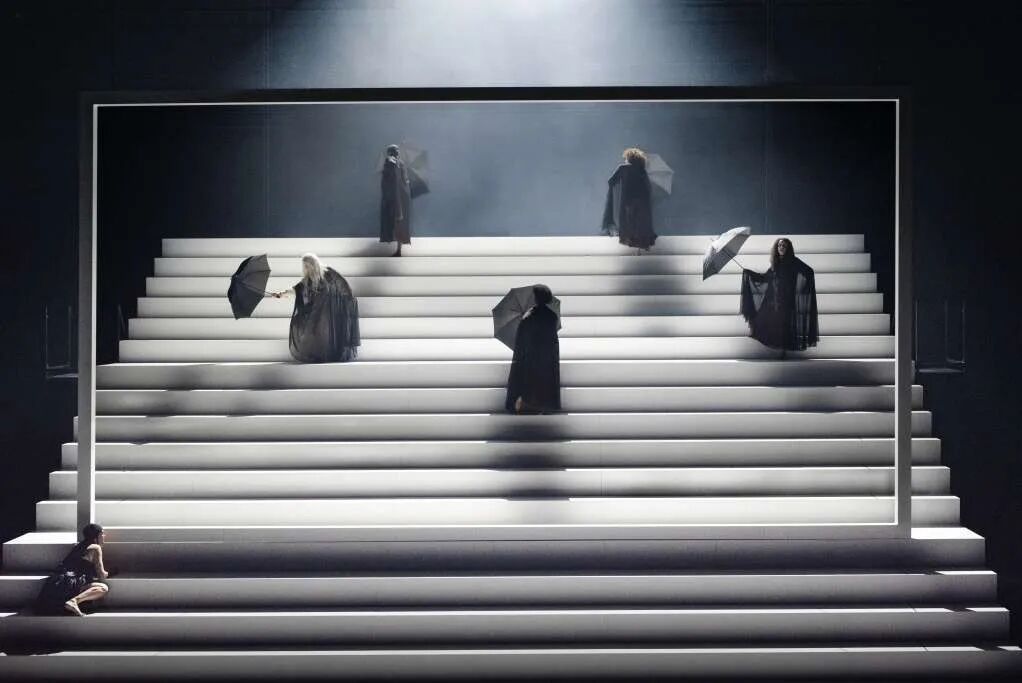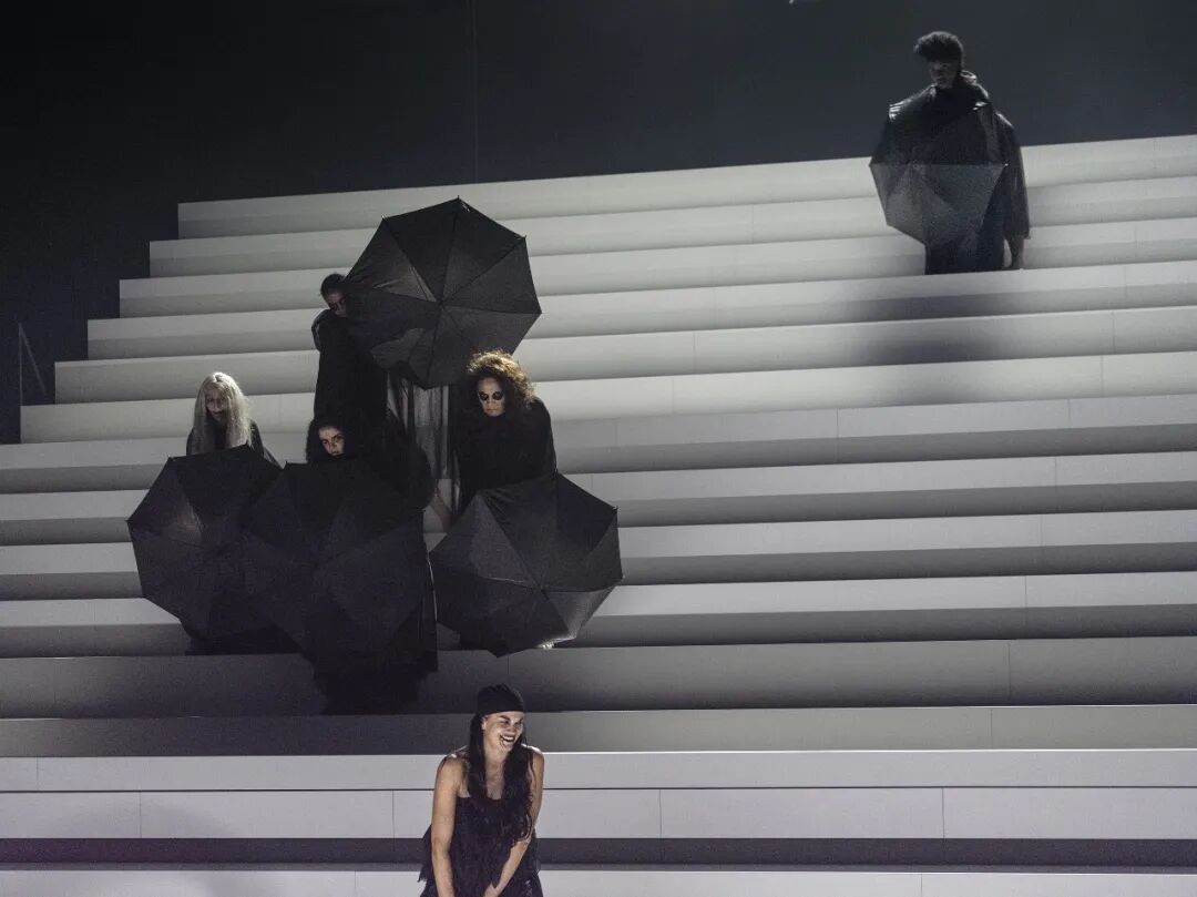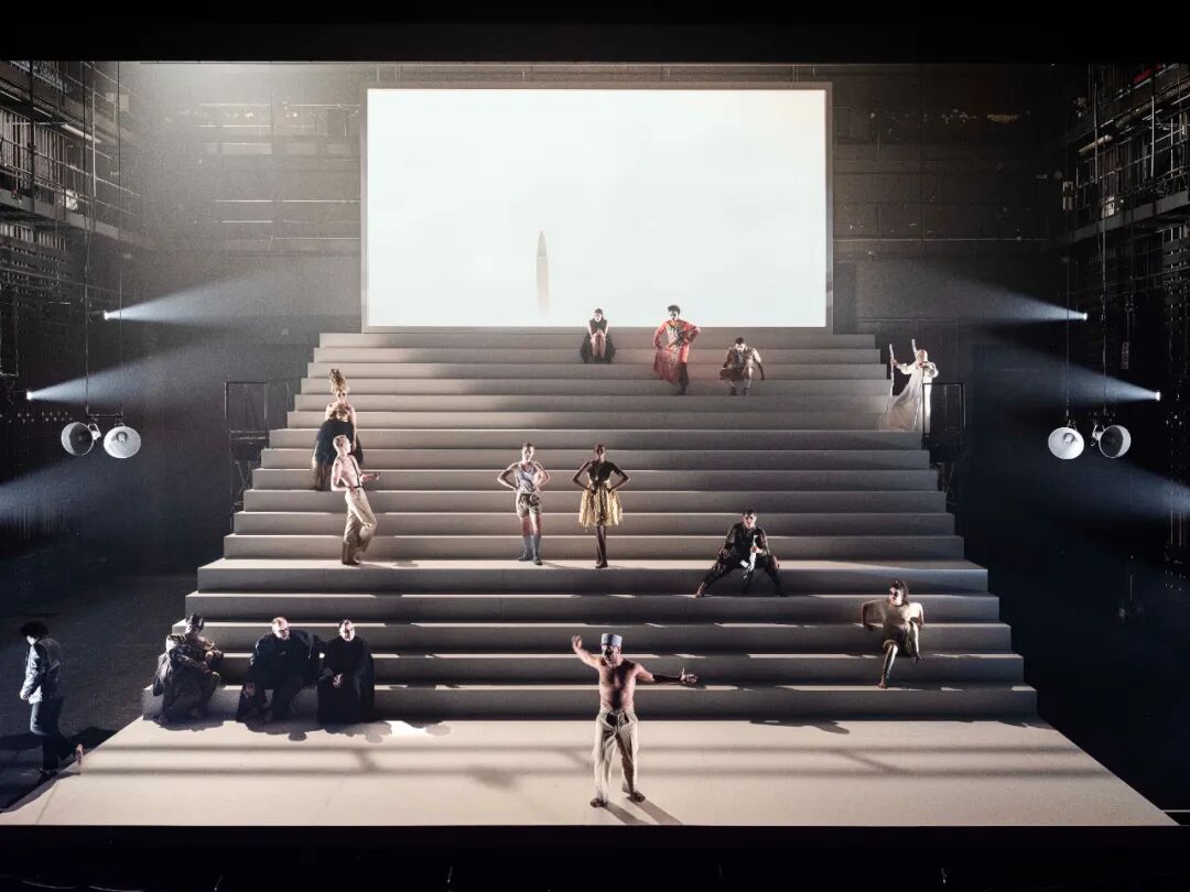 舞台上,16位演员组成歌队,共同演绎并推动这部层次丰富的文本。编舞家达米安·雅莱继与巴黎歌剧院及歌手麦当娜合作后,为该剧舞台注入幽灵般的舞蹈意象,令“生与死”的主题交织共鸣。巨大的阶梯舞台、葬礼风的服装设计与极富张力的灯光变幻,共同营造出如同宏大歌剧般的庄严氛围。