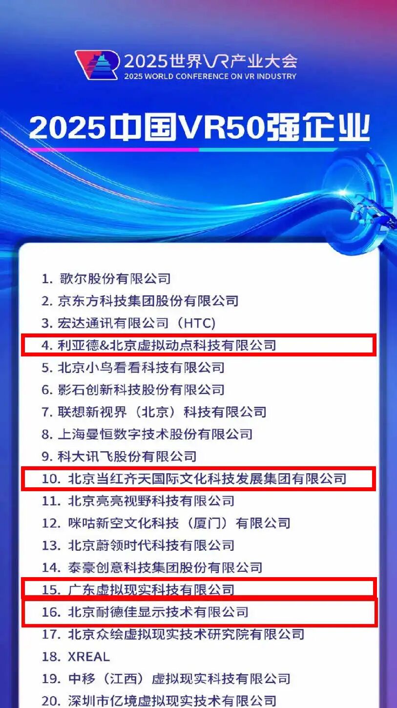 在近日闭幕的2025世界VR产业大会上,“中国VR50强企业”榜单正式发布。