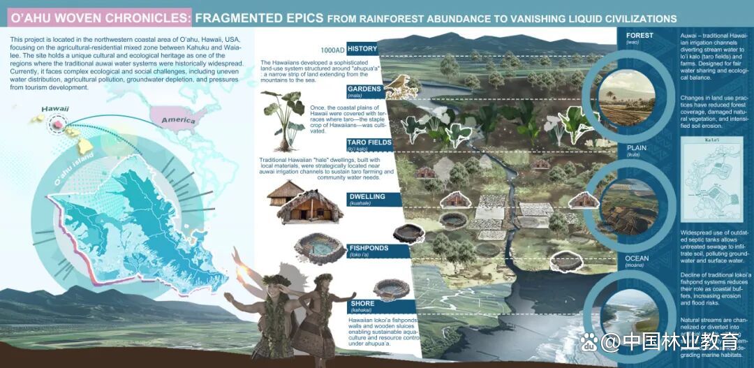 王向荣、徐昉指导的学生团队获得了分析与规划类荣誉奖。周奕欣、倪婧媛、余瑾、刘微(福建理工大学)均为本科生。他们通过将传统夏威夷水利体系融入现代生态设计,以恢复瓦胡岛的高地、农业与海岸景观。项目整合了再造林、分散式废水再利用与多功能鱼塘缓冲带等手段,以恢复水文健康、生物多样性与文化遗产。其模式展示了将文化智慧与生态修复整体整合以维系岛屿环境的探索。