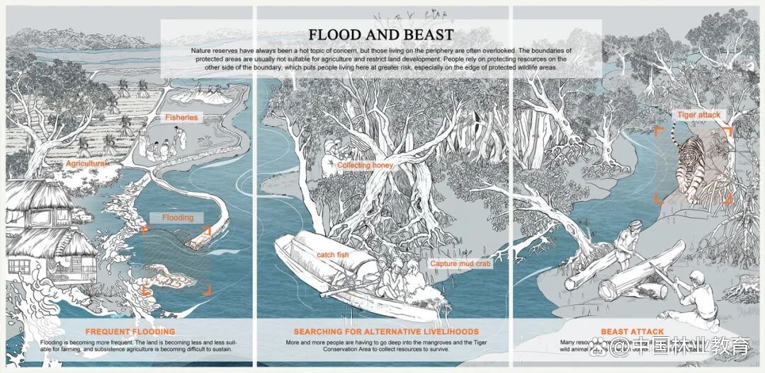 自然保护区周边社区常被迫依赖保护区内资源以维持生计,这增加了其脆弱性,尤其在保护野生动物与人类共存的地区。获得分析与规划类荣誉奖的团队,以位于恒河三角洲的孙德尔本斯(联合国教科文组织世界遗产地)为对象,直面频繁的洪水与老虎袭击严重影响居民生计与安全的挑战。他们完成的项目,旨在通过推广可持续农业实践、改善土地生态健康、应对洪水风险并间接减少人虎冲突,建立人类需求与野生动物保护之间的和谐平衡与良性循环。团队的指导教师是在李方正以及蒋帅(重庆大学)、张苏卉(上海大学)。成员有于腾飞(重庆大学)、孙杨炀、占秭瑞(上海大学)、李菁菁、许益恺、冯淑贤、朱秋蕙、李麟阁、张浩然。