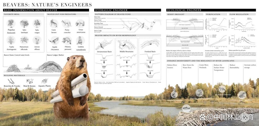 由该院本科生主持的一支参赛队伍获得了综合设计类荣誉奖。团队中有5名本科生。成员是袁业泓(北京建筑大学双培)、林鹭怡、李怡霖、曲婉琳、宋美昕、唐子尧、张曦、李頔(加州大学伯克利分校)。其指导教师为李雄、戈晓宇、段威和加州大学伯克利分校的MattKondolf。为应对加州中央谷地的地下水流失与廊道破碎问题,团队聚焦生态廊桥的恢复,构建了人-自然共修复体系。先以辅助坝体与柳树林作为栖息地、帮助海狸定居,借助海狸改造生态系统并重连廊道。后引入低影响的亭廊、漂浮栈道和自然教育民宿以支持生态旅游,为广泛推广提供了可复制的模式。