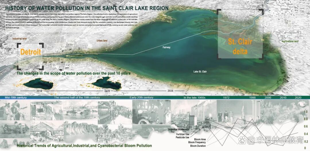 获得分析与规划类荣誉奖的作品是《五大湖之心》。学生们以连接休伦湖与伊利湖的圣克莱尔湖为中心,针对关键的上游与下游节点展开治理。上游采用“农田—湿地—河流”系统,借助生态农业、河道重塑与湿地过滤来控制氮、磷污染;下游则采用“工业建筑—阶梯净化池—水体”系统,通过绿色改造、湿地与先进过滤技术减少工业污染物。这些互联系统形成闭环,加速水流、恢复生态韧性并改善湖泊水质。在张宇、诸葛桦莹、陈静(哈佛大学)指导下,团队成员有刘青原(合肥工业大学)、洪子淇(苏州大学)、柴思敏(重庆交通大学)、祝格格(西安工程大学)、张笑丽、王湘怡(香港大学)完成了这个项目。(铁铮)