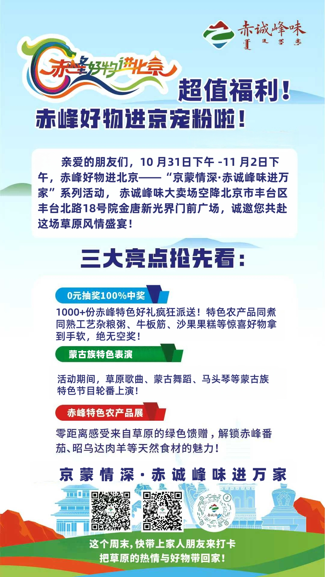日前,记者从丰台区获悉,“赤峰好物进北京,京蒙情深・赤诚峰味进万家”系列活动重磅来袭,一场满载草原风情与赤峰美味的盛会将在丰台区丰台北路18号院金唐新光界门前广场拉开帷幕,活动时间从10月31日下午15时 至11月2日下午,连续三天。