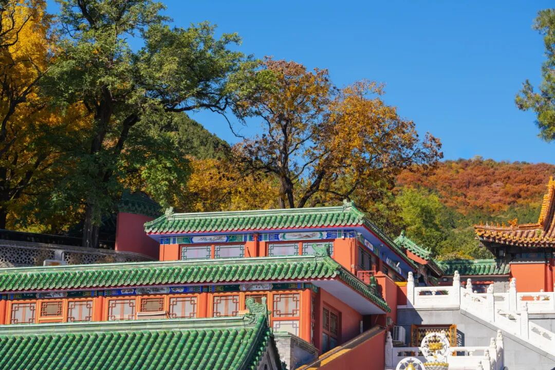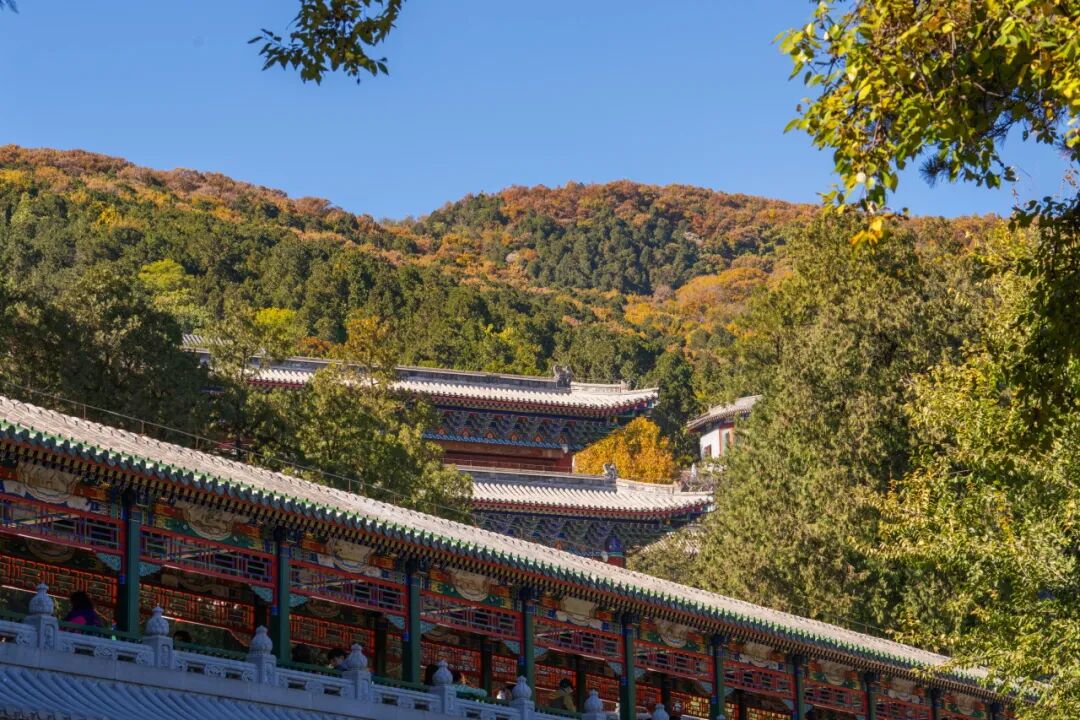 每逢秋时,便以古建的轮廓为底,用银杏的明黄、枫树的火红、松柏的苍翠点缀,恣意挥洒,层层浸染,将十二景之一的“深秋红叶”完美呈现。
