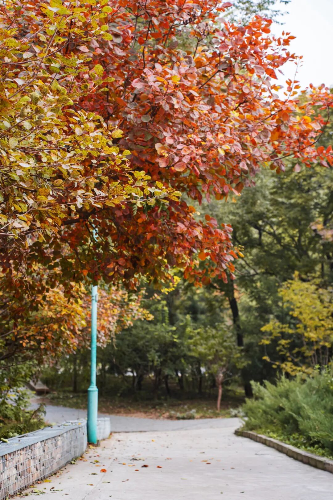 在橙黄橘绿间,秋风温柔地拂过树梢,卷起叶在空中打着旋儿,缓缓落下。落叶沙沙,秋日通透的空气让公园景致格外清晰。