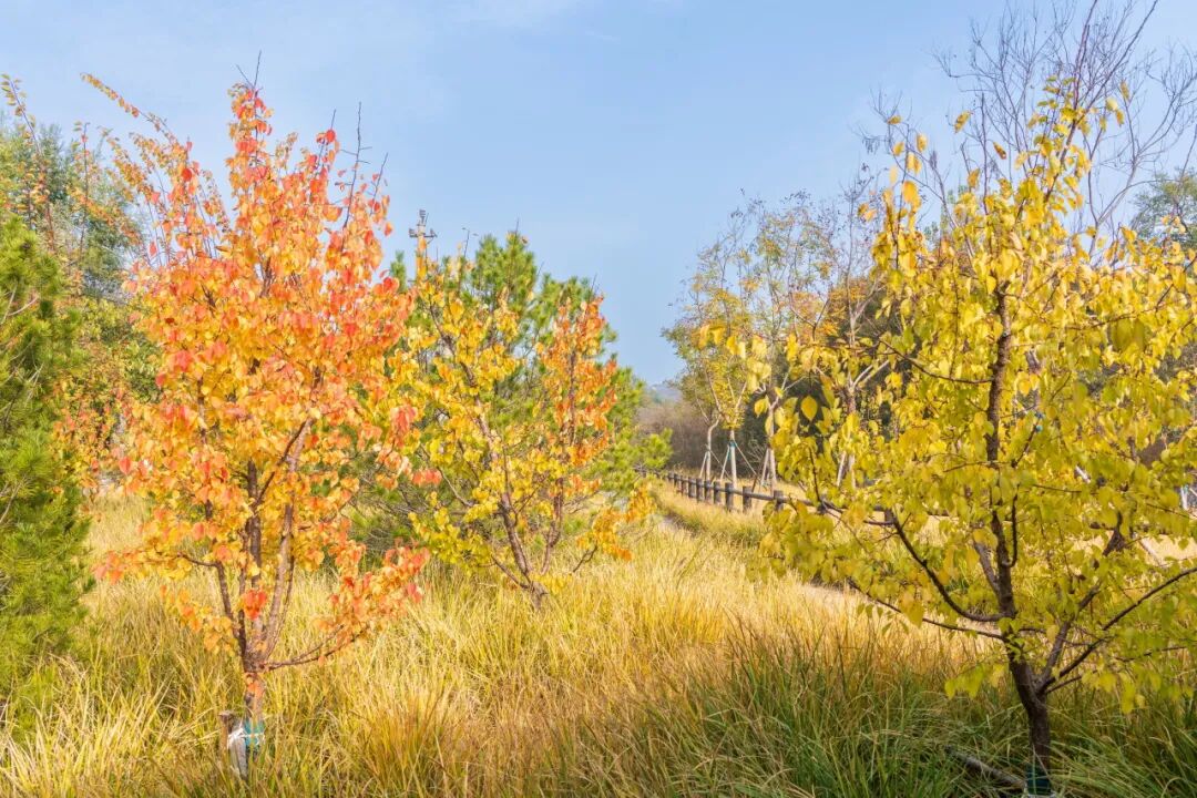 一夜三秋雨,老山城市休闲公园“穿上秋衣”——从夏日的葱茏化为秋日的斑斓,将建筑、围墙、步道一并揽入辉煌。