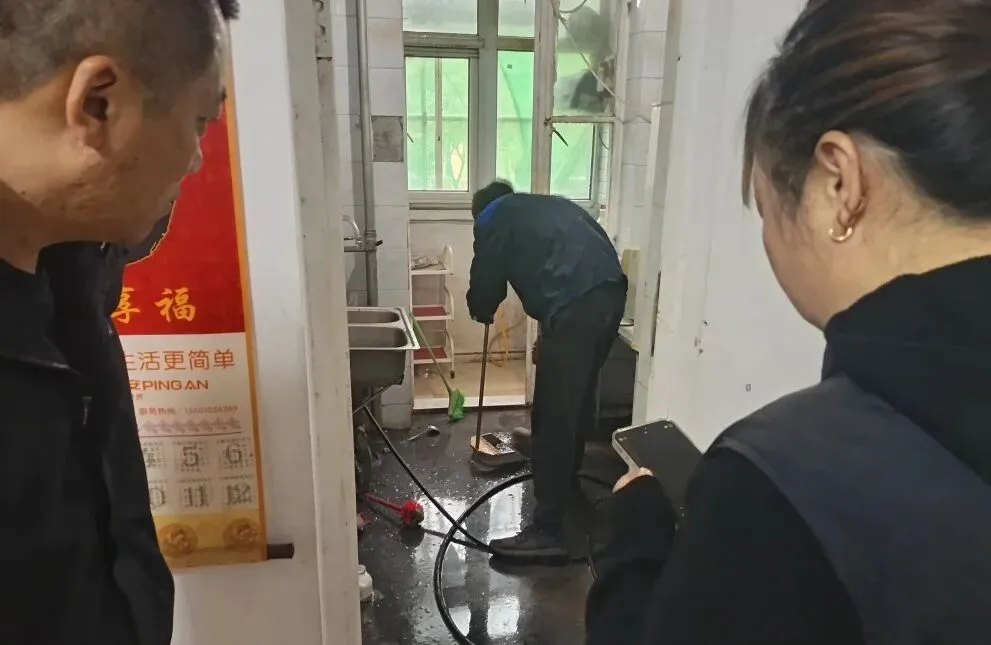为避免渗水范围扩大,网格员先协助杨先生清理现场积水,同时联系街道应急抢修队伍与专业疏通公司,敲定“紧急疏通+源头排查”的处置方案。