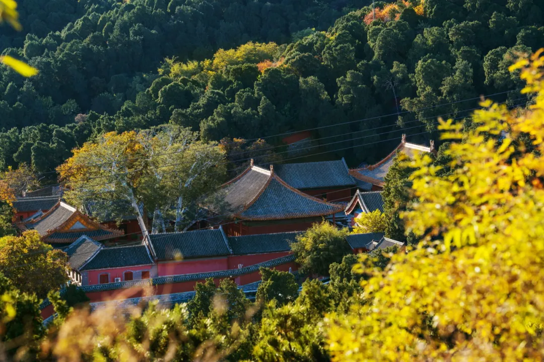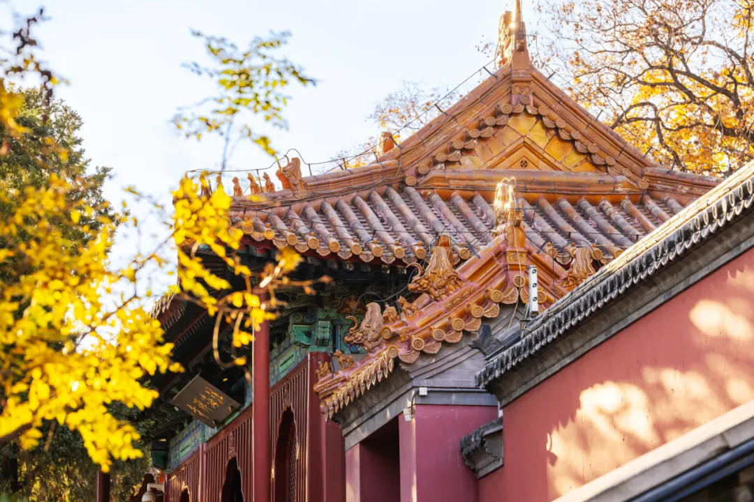 秋风吹过林梢轻响,阳光投下斑驳树影,法海寺就坐落于林海之间。