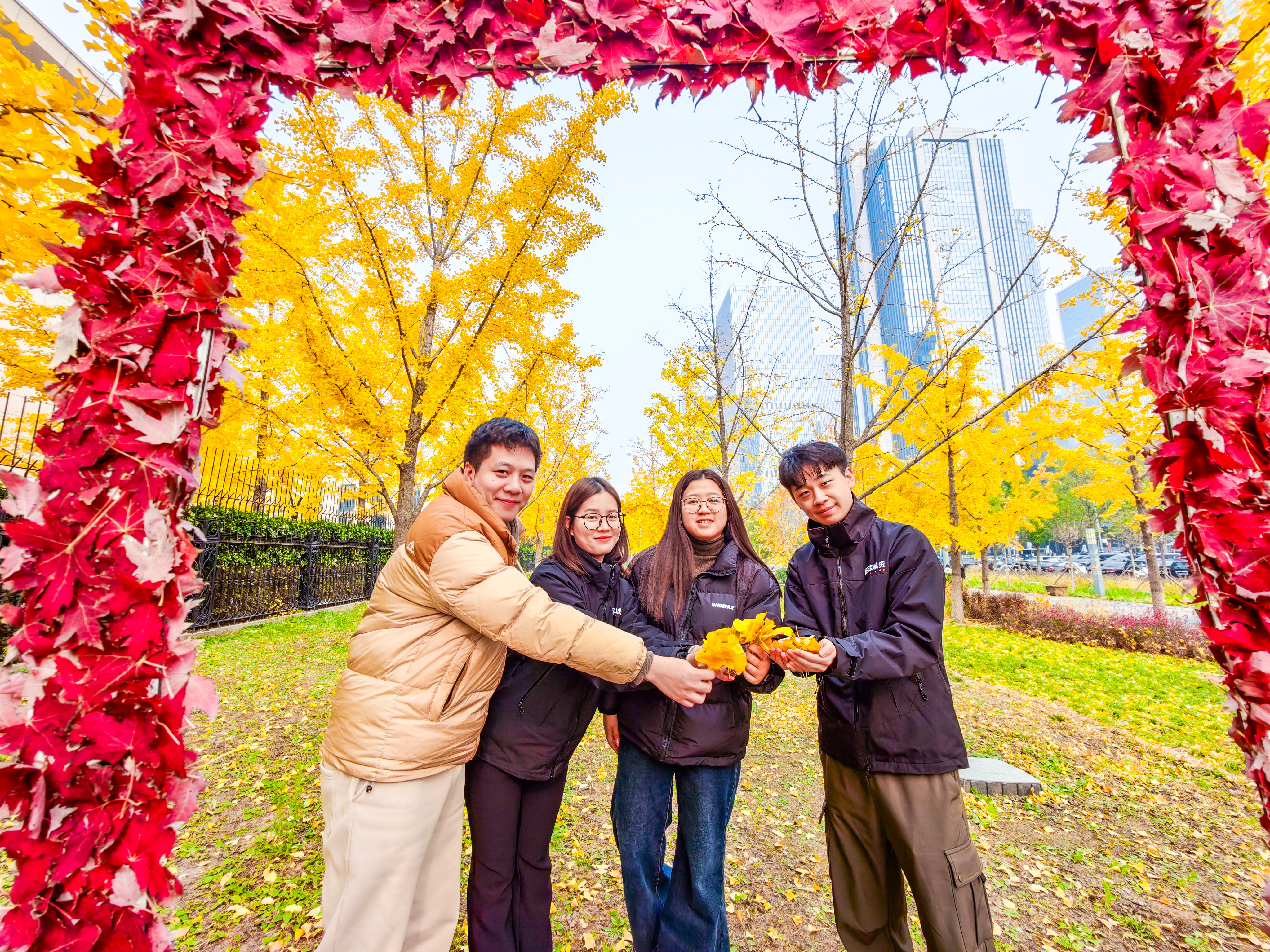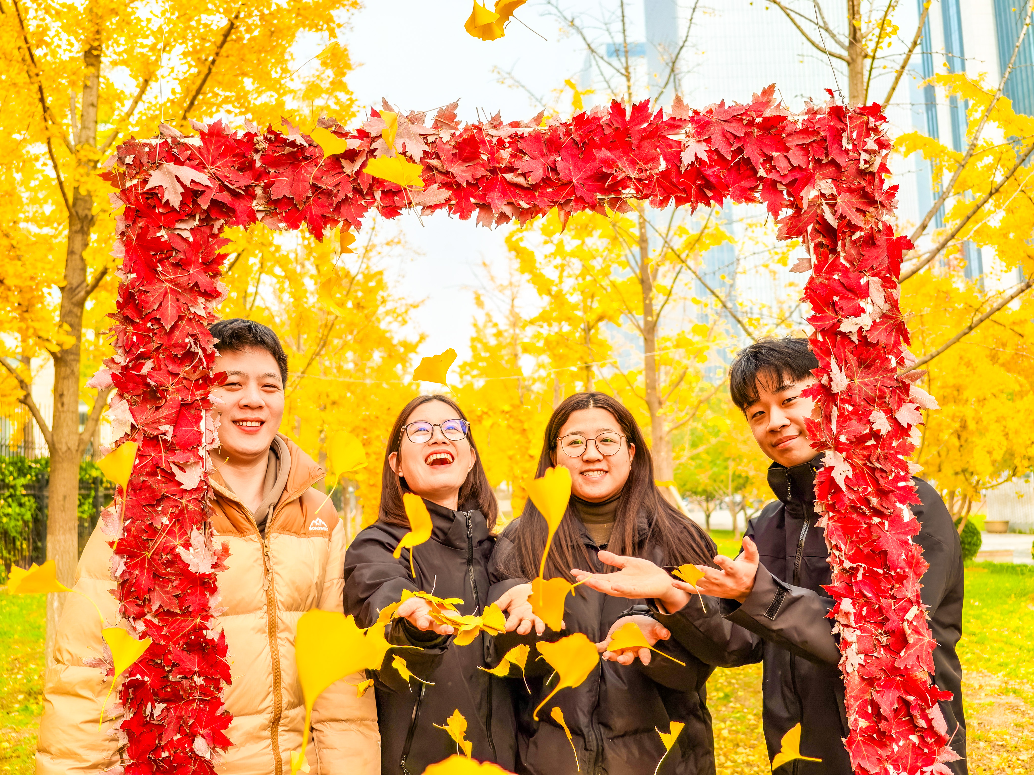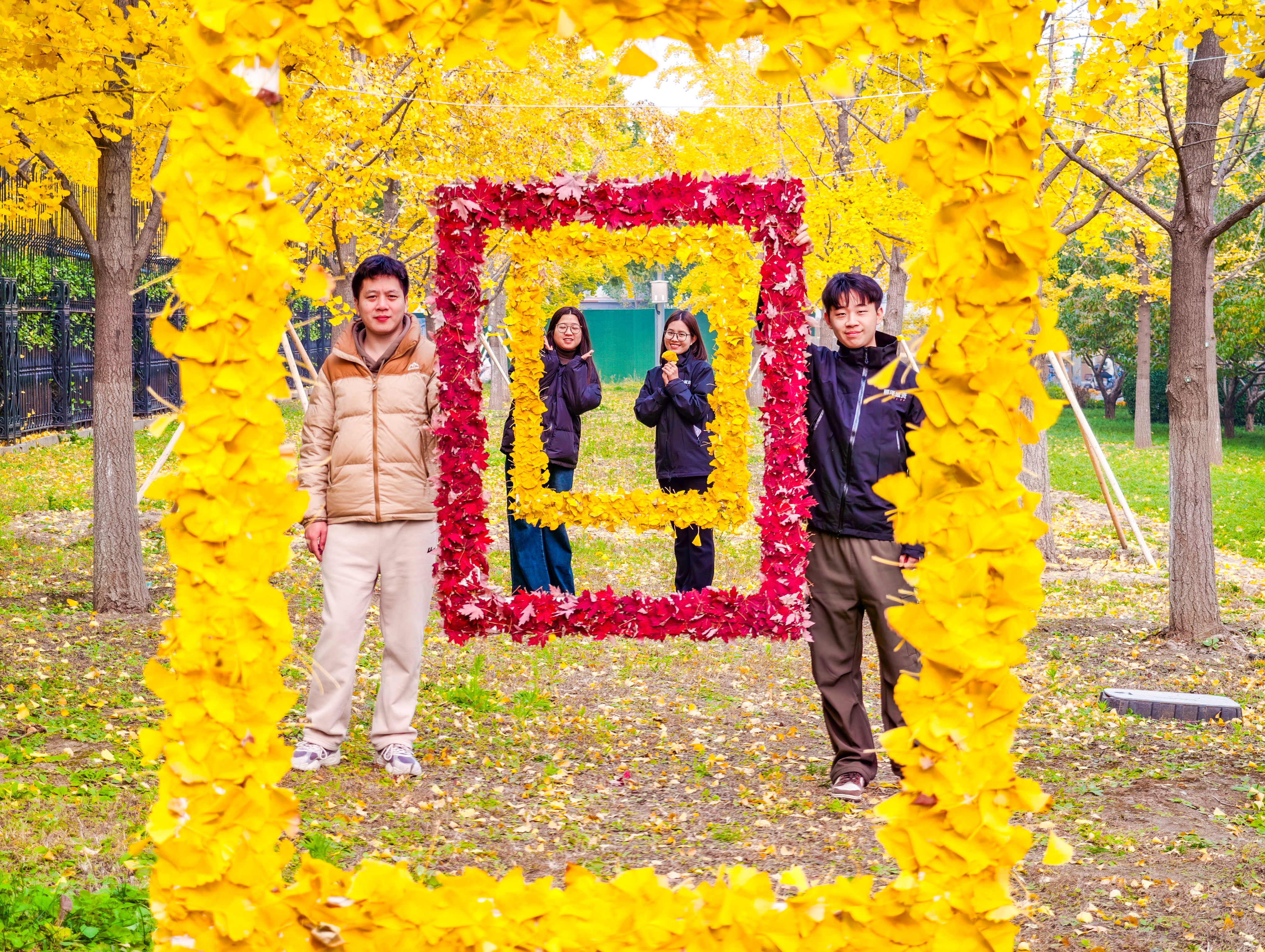深秋的阳光透过画框,枫叶的红、银杏的黄与丽泽楼群交织在一起,形成一幅幅天然油画。