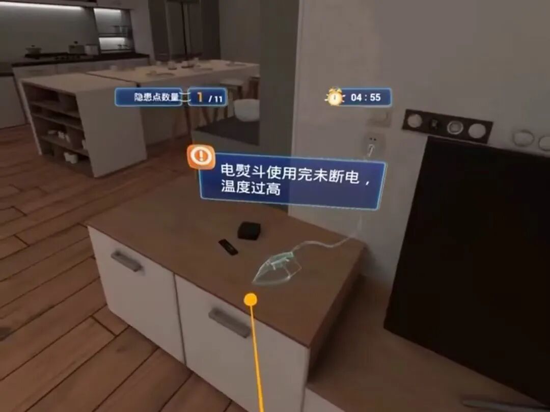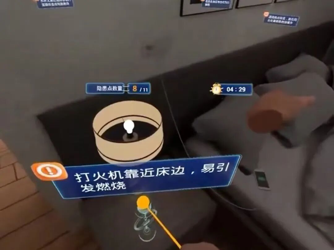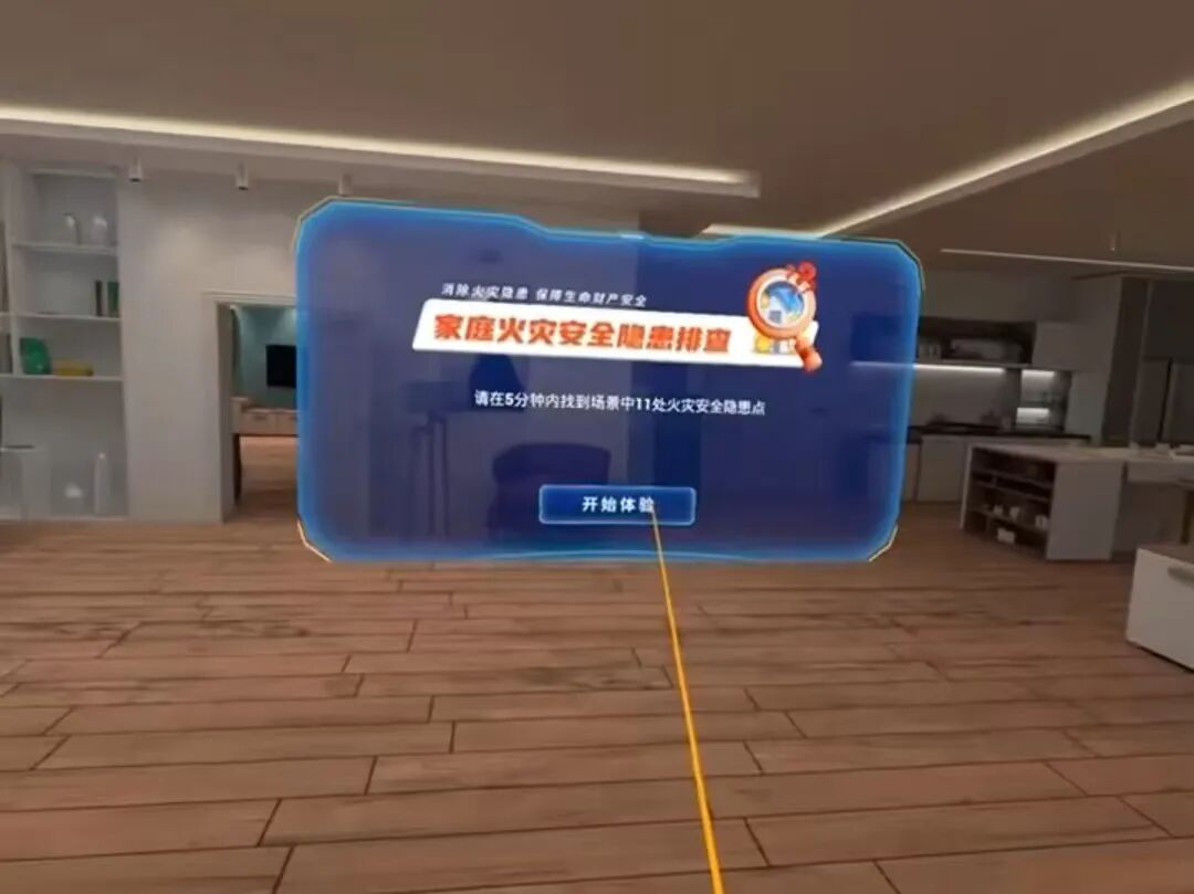 这款VR设备,针对居民日常生活中的消防安全隐患,专门研发了“安全隐患排查”和“火场逃生演练”两大核心模块。在“安全隐患排查”场景中,居民佩戴VR设备即可“走进”高度还原的虚拟家庭环境,通过互动操作查找电线老化、充电器过载、易燃物堆积等常见隐患。系统会实时提示并讲解整改方法,让学习过程既直观又深刻。