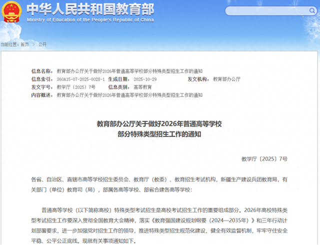 近日,教育部办公厅发布《关于做好2026年普通高等学校部分特殊类型招生工作的通知》和《《2026年普通高等学校部分特殊类型招生基本要求》。