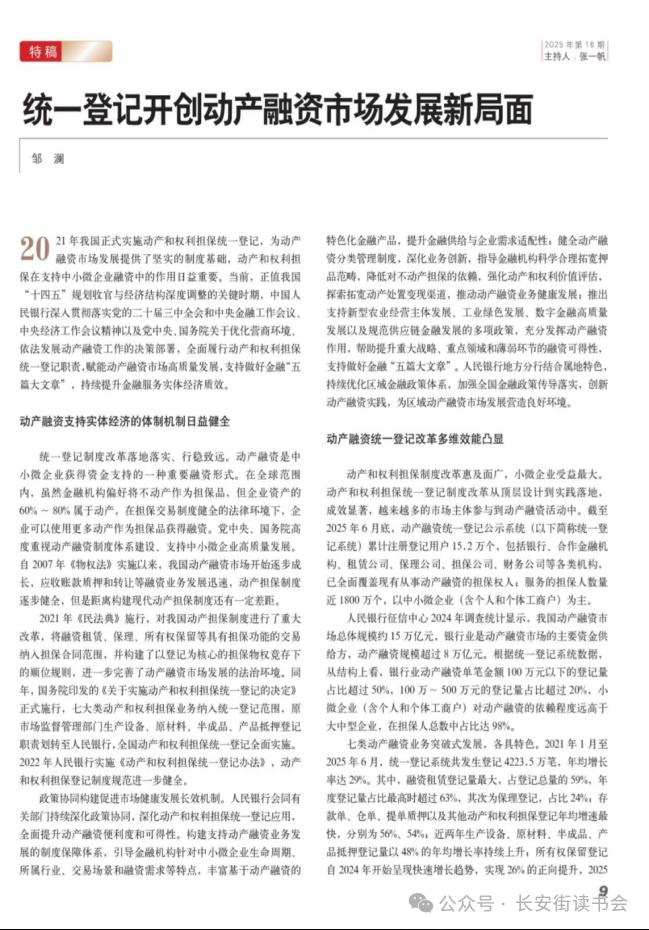 邹澜在《中国金融》2025年第16期撰文《统一登记开创动产融资市场发展新局面》指出,2021年我国正式实施动产和权利担保统一登记,为动产融资市场发展提供了坚实的制度基础,动产和权利担保在支持中小微企业融资中的作用日益重要。当前,正值我国“十四五”规划收官与经济结构深度调整的关键时期,中国人民银行深入贯彻落实党的二十届三中全会和中央金融工作会议、中央经济工作会议精神以及党中央、国务院关于优化营商环境、依法发展动产融资工作的决策部署,全面履行动产和权利担保统一登记职责,赋能动产融资市场高质量发展,支持做好金融“五篇大文章”,持续提升金融服务实体经济质效。一是动产融资支持实体经济的体制机制日益健全;二是动产融资统一登记改革多维效能凸显;三是创新动产融资服务达到国际领先水平;四是持续深化改革更大释放动产融资潜能。中国人民银行从应收账款质押登记起步,经过十多年的持续努力,推动实现了我国动产和权利担保统一登记,促进我国动产融资市场发展取得长足进步。展望未来,我国即将迈入第十五个五年规划周期,中国人民银行将继续巩固动产和权利担保统一登记改革成效,持续深化动产融资改革,更大释放动产融资潜能,扎实做好金融“五篇大文章”,助力实体经济高质量发展。