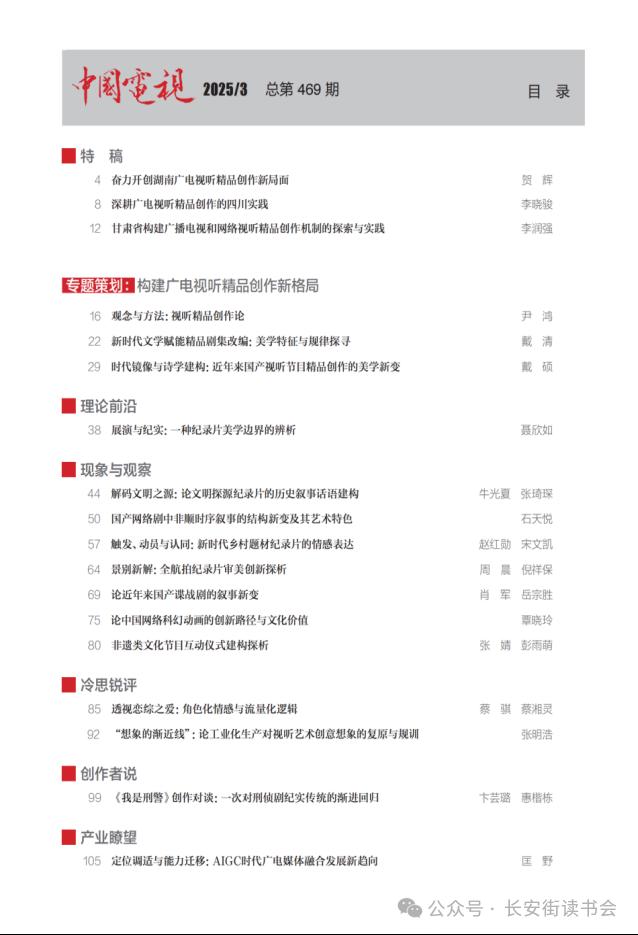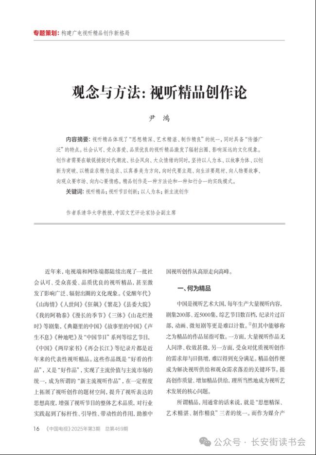 尹鸿在《中国电视》2025年第3期撰文《观念与方法:视听精品创作论》系统梳理了近年来涌现的代表性精品作品背后的创作逻辑,指出精品创作是对时代潮流、社会风向、大众情绪的敏锐捕捉,视听精品体现了“思想精深、艺术精湛、制作精良”的统一,同时具备“传播广泛”的特点。社会认可、受众喜爱、品质优良的视听精品激发了辐射出圈、影响深远的文化现象。创作者需要在敏锐捕捉时代潮流、社会风向、大众情绪的同时,坚持以人为本、以故事为体、以创新为突破、以精益求精为追求、以真善美为方向,向时代要主题、向生活要题材、向人物要故事、向观众要市场、向内心要情感。精品创作是一种方法论、一种知行合一的实践模式。精品创作需要勇气,需要敏锐的洞察、艺术的灵感,需要站在前人肩膀上的视野,也需要悲天悯人的向上向善之心,这样才能生产出“以人民为中心”创作导向所期待的艺术精品。