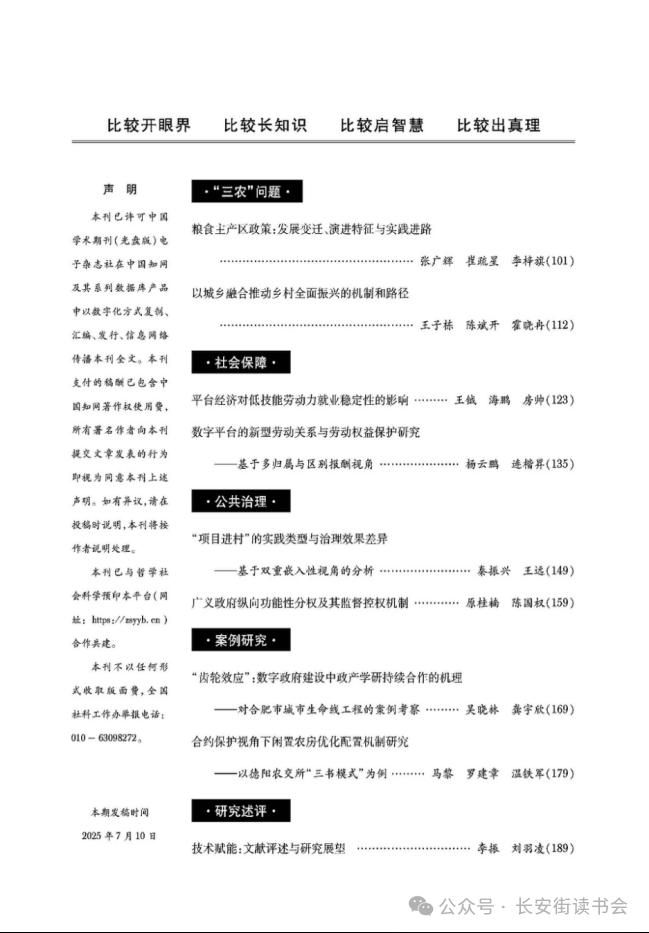 余成龙、郑晓华在《公共行政评论》2025年第3期撰文《基层治理中历史遗留问题何以产生?对政府决策中“当下主义”策略的案例分析》指出,基层治理中历史遗留问题在漫长等待中并非无法开启“政策之窗”,而是未能进一步开启“决策之窗”。基层政府决策中的“当下主义”策略是这类问题产生的深层原因。沿海Q村的案例表明,早期基层官员堆叠当下资源、压缩当下成本的“主动当下主义”策略,实现了发展加速,但也将问题遗留给了未来。继任基层官员将这些遗留问题视作一种治理风险,并通过拖延问题、上交问题、转移问题、修补问题等“被动当下主义”策略,对其进行及时处置与隔离,却也导致问题被持续搁置。结果是,不同时期基层政府“当下主义”策略的决策连续统,使初始问题被留在时间里,继而被困在时间里,最终变得越来越难以解决。事实上,面对发展机遇和社会风险带来的时间压力,基层政府选择“当下主义”策略,很大程度上是一种情境理性。悖论性在于,赋予其合理性的外在条件在未来会反向削弱其合理性,从而导致基层治理中的历史遗留问题被源源不断地再生产出来。