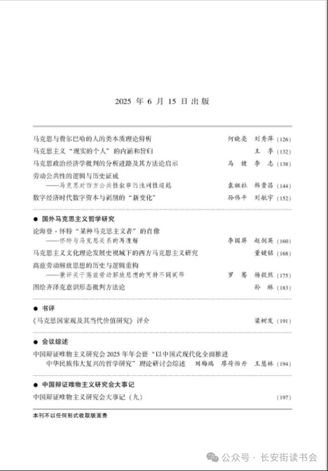 何晓亮、刘秀萍在《马克思主义哲学》2025年第3期撰文《马克思与费尔巴哈的人的类本质理论辨析》指出,人的类本质理论是马克思哲学关于人的本质学说的重要内容。高清海教授的类哲学理论区分了作为“物的种”概念和作为“人的类”概念的两种思考人的本质的“类” 哲学思维方式,并由此确立了马克思哲学是“以人的方式来观人”的类哲学理论。基于此, 费尔巴哈人的类本质理论本质上不过是作为“物的种”概念的抽象人性论;而马克思人的类本质理论绝非费尔巴哈抽象人性论的继续,两者无论在理论缘起、哲学思维方式和理论范式上都有极大的差异,对这种差异进行必要的澄清是我们正确认识马克思人的类本质理论的前提。