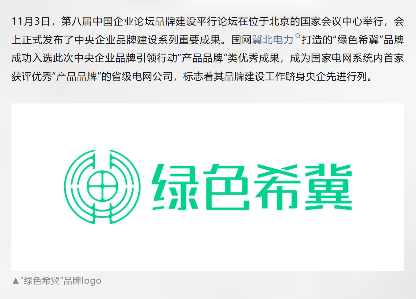 国网冀北电力“绿色希冀”品牌荣获央企“产品品牌”类优秀成果
