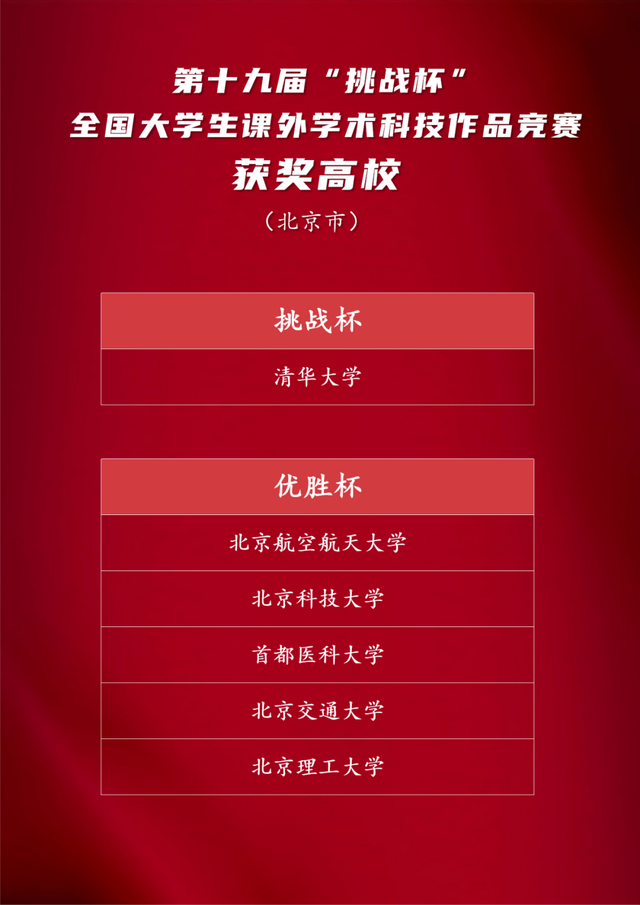 本届赛事中,清华大学捧得最高荣誉“挑战杯”,北京航空航天大学、北京科技大学、首都医科大学、北京交通大学、北京理工大学获得优胜杯。