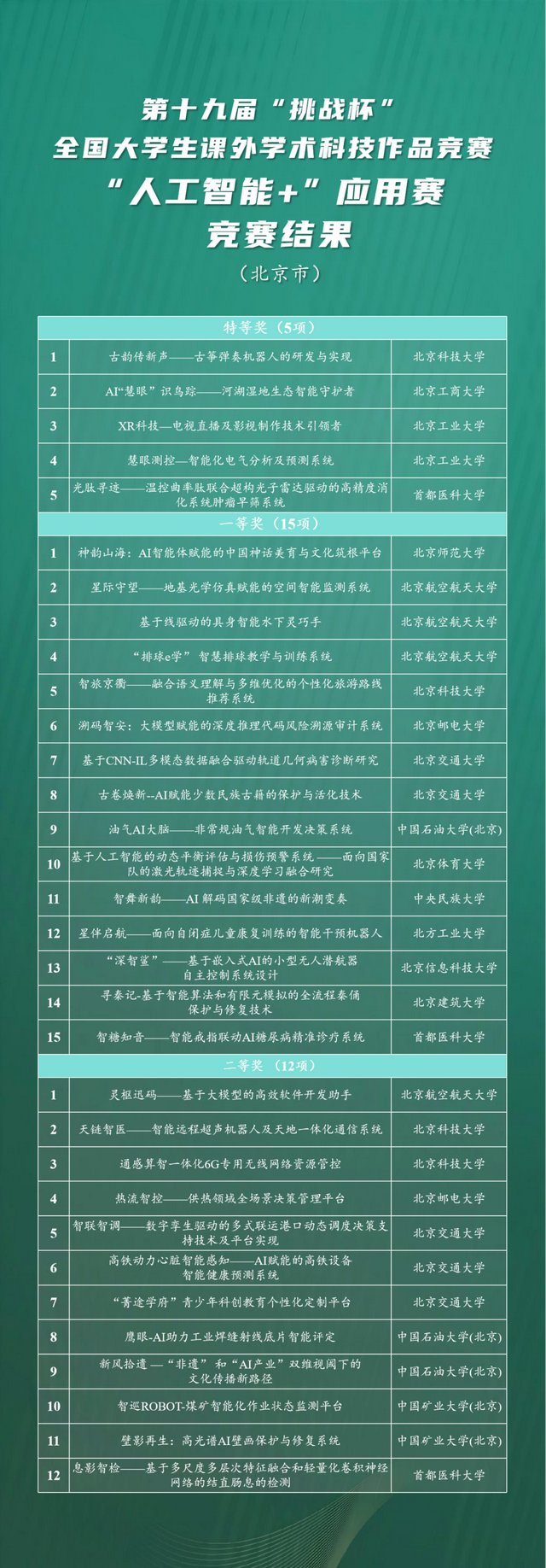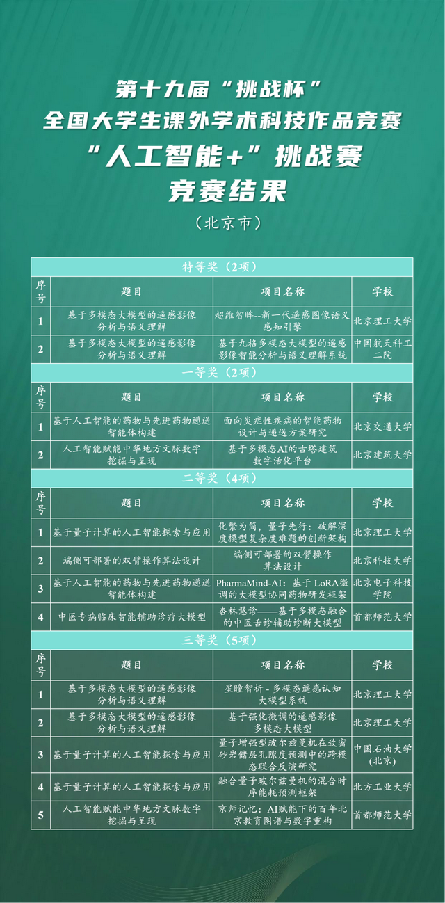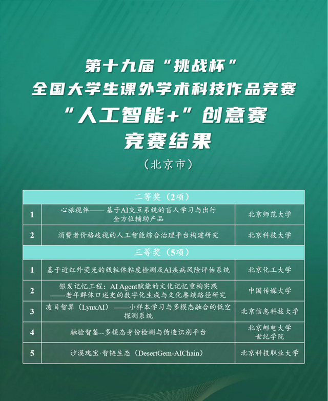 70所北京高校报名参赛2673项作品,涉及主赛道、“人工智能+”应用赛、“人工智能+”挑战赛、“人工智能+”创意赛、“揭榜挂帅”擂台赛等全赛道,最终共有42所高校获得各类奖项436个,创下6校捧杯、63项特等奖、23个“擂主”的历史佳绩,体现了北京市近年来发挥科技创新优势、培养拔尖创新人才、打造科技创新中心和高水平人才高地的最新成果。