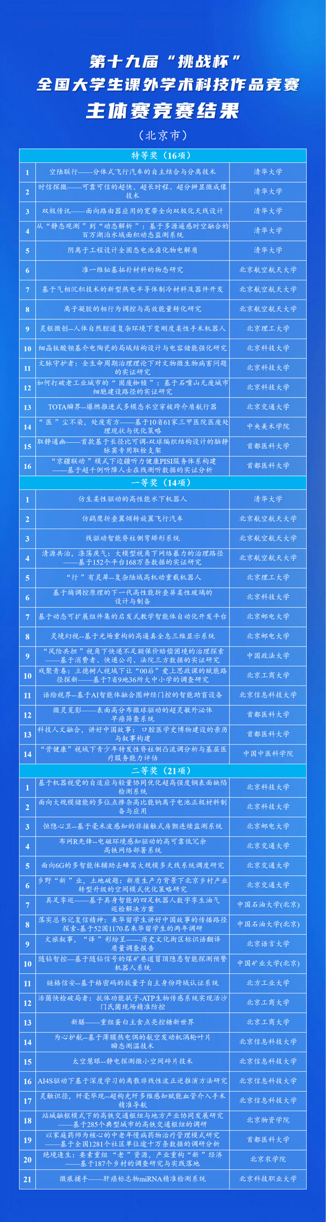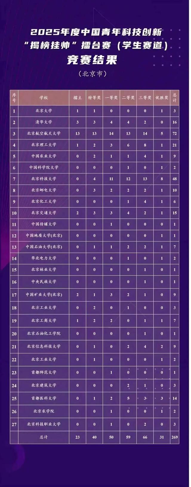 中国青年科技创新“揭榜挂帅”擂台赛分别于2024年和2025年在北京、浙江和8个主擂台城市完成比赛,北京高校共获奖269项,其中,23个项目夺得“擂主”,获得特等奖40项,一等奖50项,二等奖59项,三等奖66项,优胜奖31项。