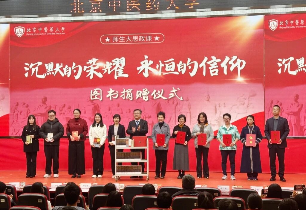 在本次思政大课上,5位烈士后代以及慈文传媒股份有限公司书记赵建新将以烈士的英雄事迹书写而成的红色书籍——《沉默的荣耀》《冷月无声——吴石传》《抗日儒将——陈宝仓》《朱枫传》《朱枫烈士纪念文集》——赠予北京中医药大学校图书馆,成为师生了解隐蔽战线英烈事迹的重要资料。