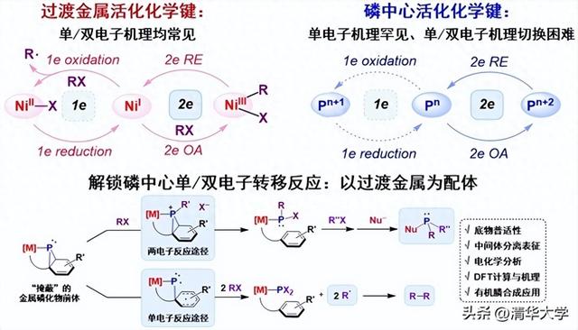 模拟过渡金属的主族元素催化体系是前沿基础研究。碳−卤键活化不仅是基础有机化学教科书上的经典内容,也是镍、铜、铁等过渡金属催化偶联反应的基元反应,包括单电子(1e,自由基)或双电子(2e,极性)两种常见途径。包括磷在内的多种主族元素正越来越多地作为过渡金属催化剂的替代物成为研究热点。然而,磷介导的单电子转移(SET)反应仍然罕见,并且单电子、双电子反应途径的切换本质上具有挑战性。这是由于磷元素自身缺乏能量可及的3d轨道,其氧化还原反应依赖于3s/3p价层电子轨道,生成磷中心自由基中间体通常需要强还原剂或光化学氧化条件,且控制其反应途径困难。