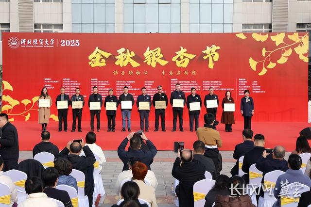 今天上午10点,河北经贸大学2025金秋银杏节开幕。开幕式上举行了河北经贸大学数字文旅产业学院共建单位授牌仪式,河北经贸大学党委书记李晓华为12家合作企业负责人授牌。