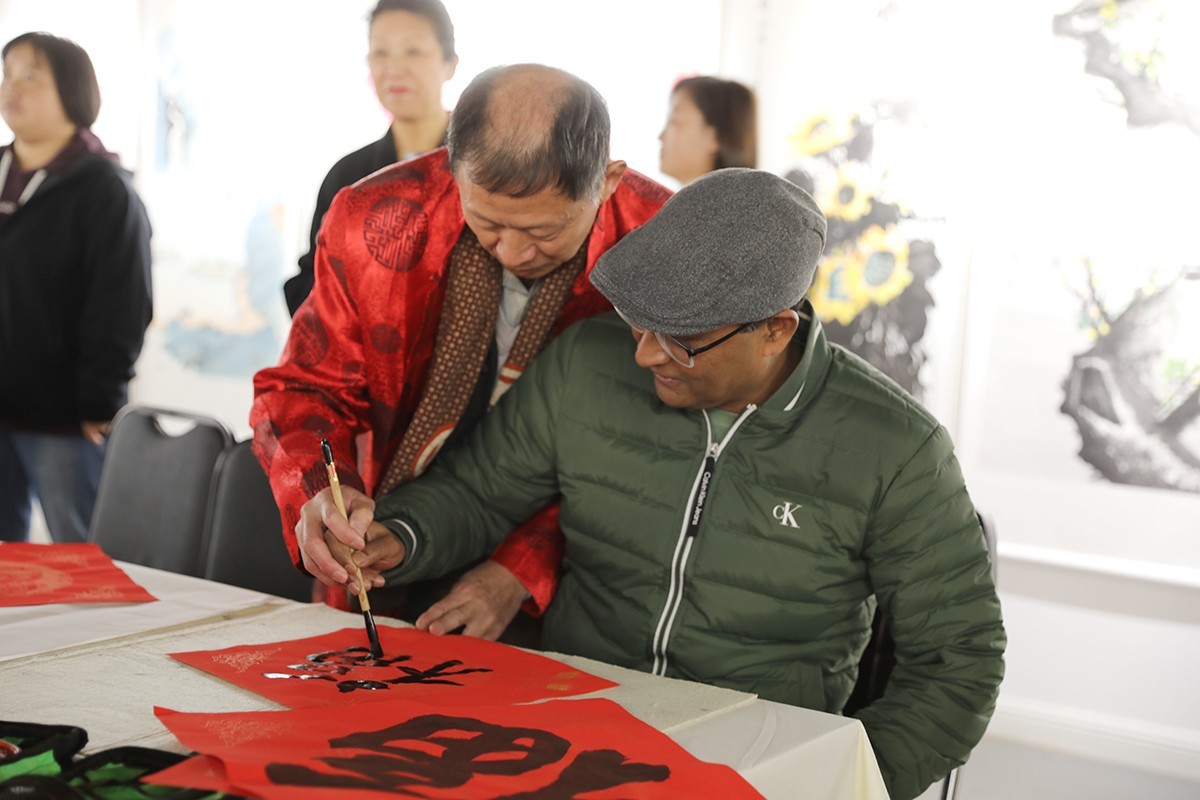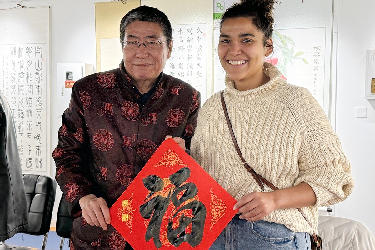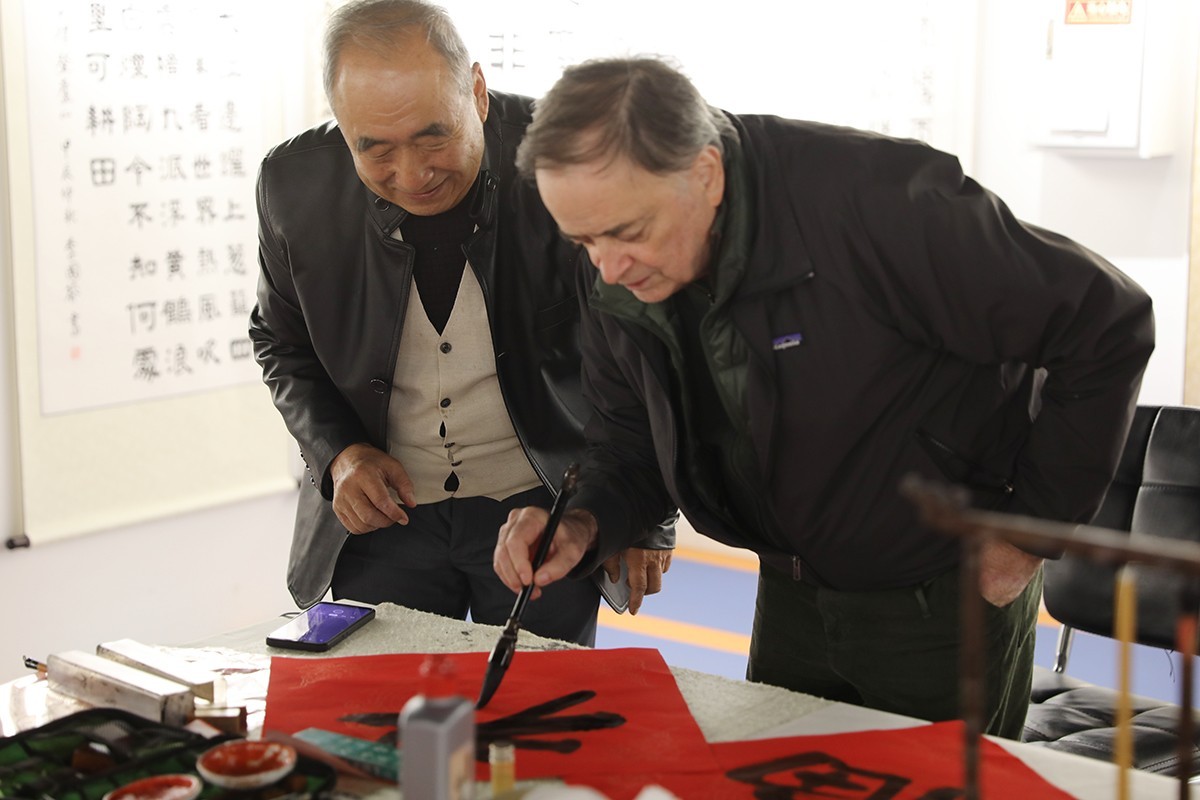 在扎染环节,中外居民在老师的讲解下了解扎染历史,并体验图案设计、折叠、捆扎与染色的全过程。每一件作品的展开都是像独一无二的“开盲盒”般体验,蓝白相间的花纹,藏着传统智慧与个人创意的碰撞。在书法体验环节,来自社区书法协会的老师带领外籍居民从最基础的执笔、运笔学起,共同书写寓意吉祥的“福”字。在笔墨纸砚间,感受汉字经久不衰的结构之美。