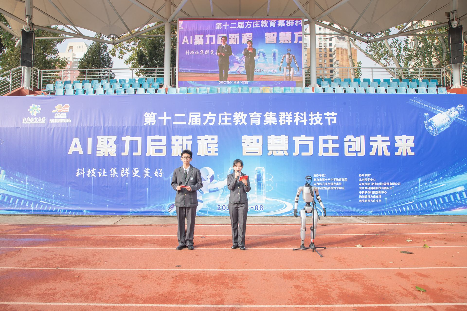 开幕式上,两位学生和AI机器人搭档共同主持,展现人机协作的科技魅力。丰台区教委副主任王振东在致辞中点明了这创新一幕背后的深意。他指出,作为首都高质量发展的重要承载地,丰台区始终坚守将科技教育作为基础教育“强基工程”的核心抓手,而方庄教育集群科技节,正是这份坚守与创新的生动缩影。他勉励同学们在科学的海洋中扬帆远航,在创新的道路上勇攀高峰。