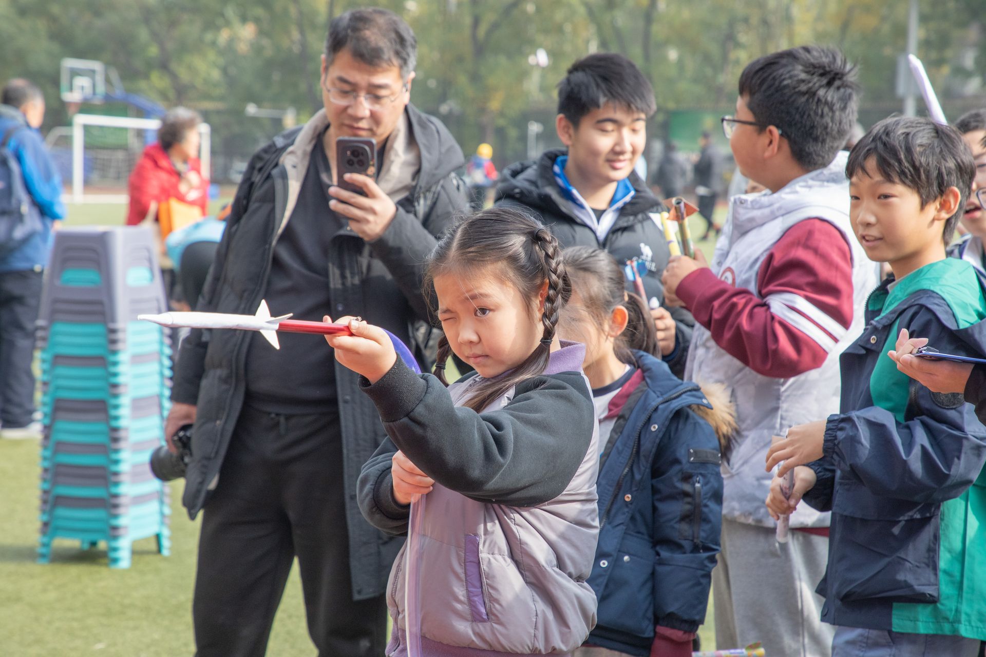 与此同时,竞技场上则是另一番专注景象。气动火箭、纸飞机标靶、橡筋动力模型飞机等11项竞赛激烈进行。选手们屏息凝神,调试、瞄准、发射……每一次成功的飞行,都伴随着欢呼与掌声,这是理论与实践最直接的碰撞。