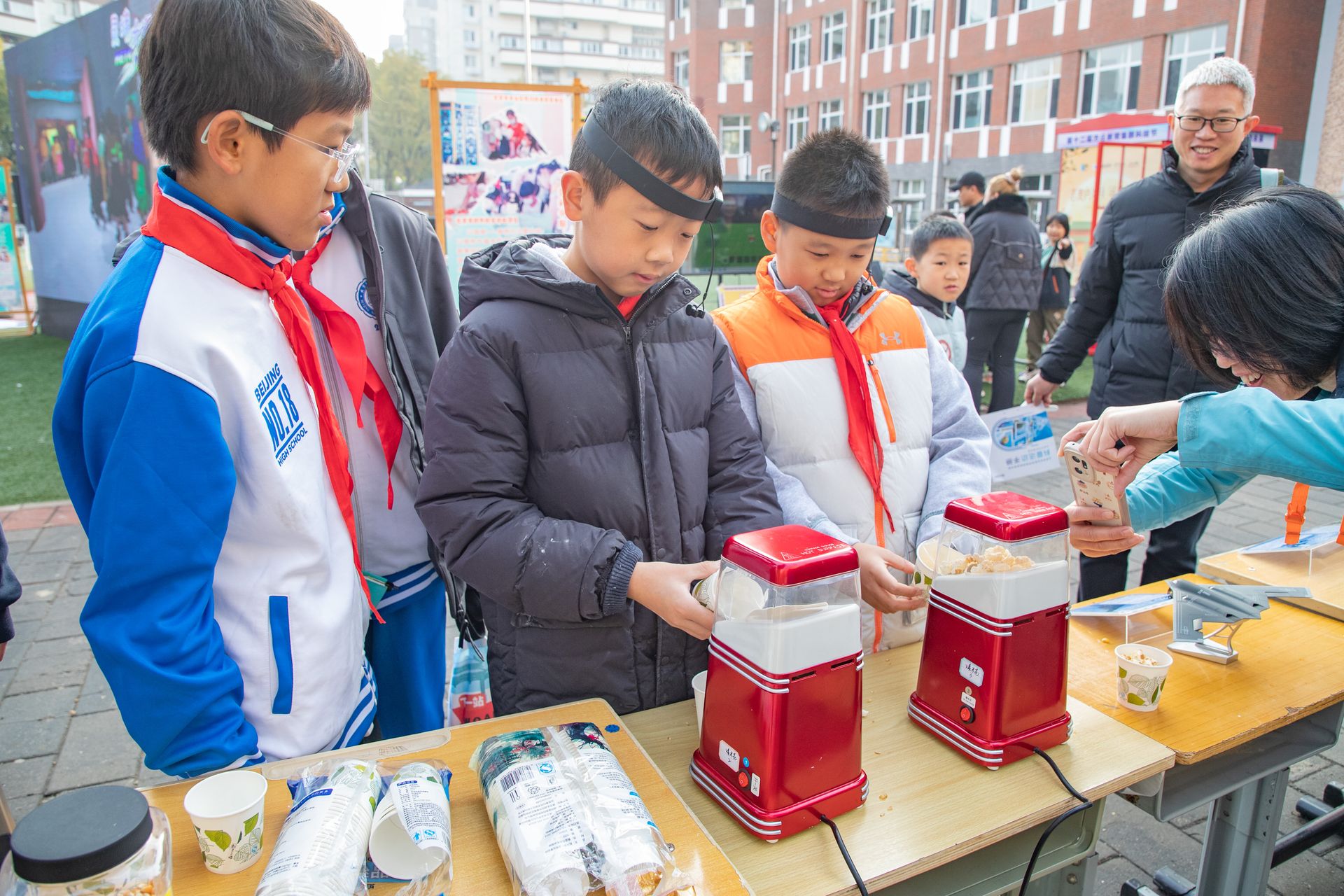 互动展示区中,集群各校精心设置的18个互动项目前早已人潮涌动。在AI机器人展示区,孩子们与智能体对话、协作;在非遗体验区,古老的扎染技艺与风筝制作吸引着众多目光,传统与未来在此刻交织;更令人称奇的是“脑电波爆米花机”,当一位初中生集中注意力,面前的设备随之启动并爆出玉米花时,围观的同学们发出了阵阵惊叹——思维的力量,第一次变得如此直观可见。