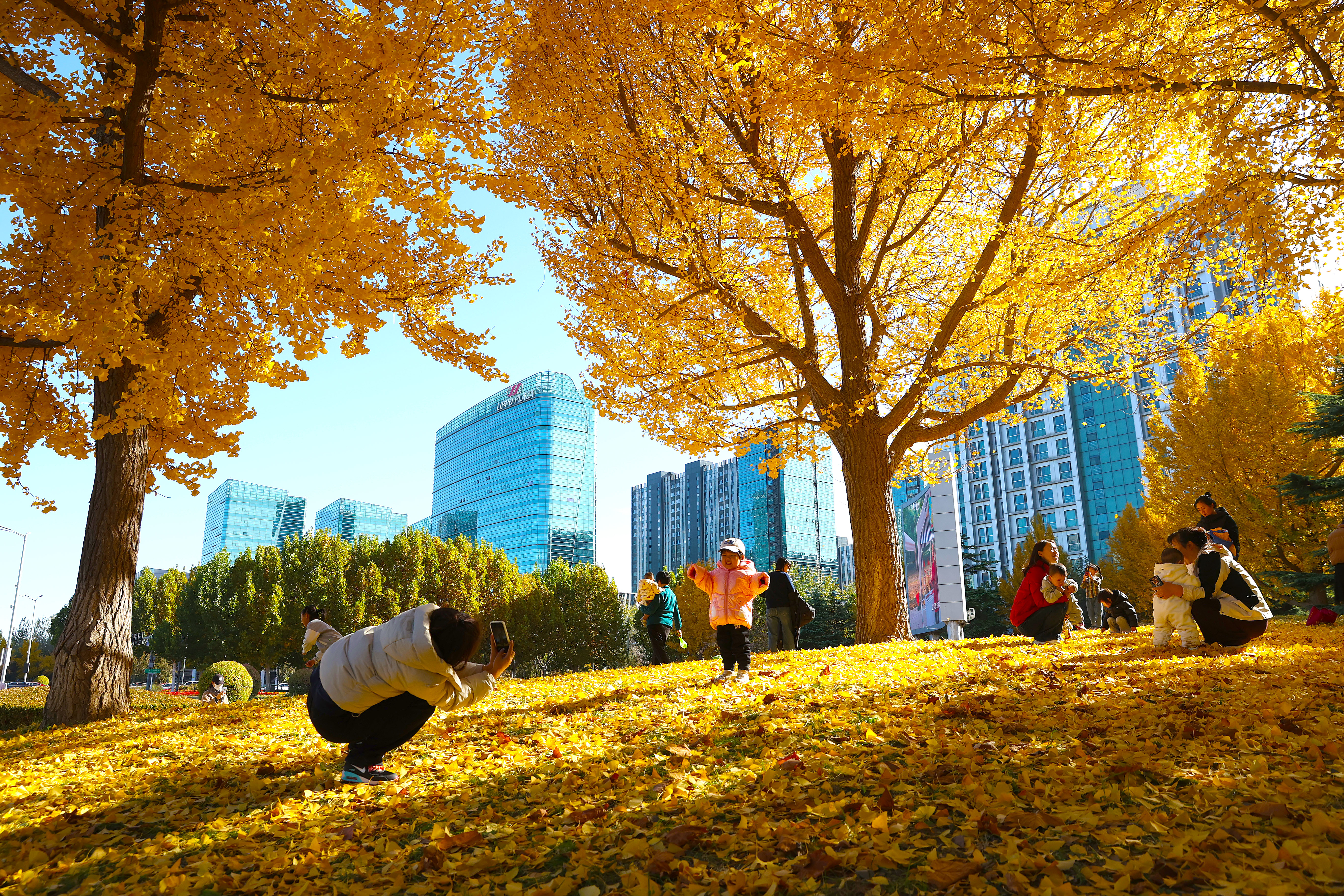 荣华北路西侧的银杏树下,家长带着孩子打卡这一秋日美景。