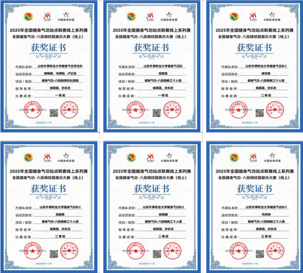 近日,2025年全国健身气功·八段锦校园展示大赛圆满落幕。山东外事职业大学由体育部教师和社团学生组成的代表队在比赛中表现优异,斩获一等奖2项、二等奖3项、三等奖1项。其中,学生组由郝艳薇、马博韬、卢正浩组成的团队荣获学生组一等奖;侯英霞老师荣获教工组一等奖;侯世豪、段建英、赵晓晶三位老师荣获教工组二等奖;巩传尚老师荣获教工组三等奖。