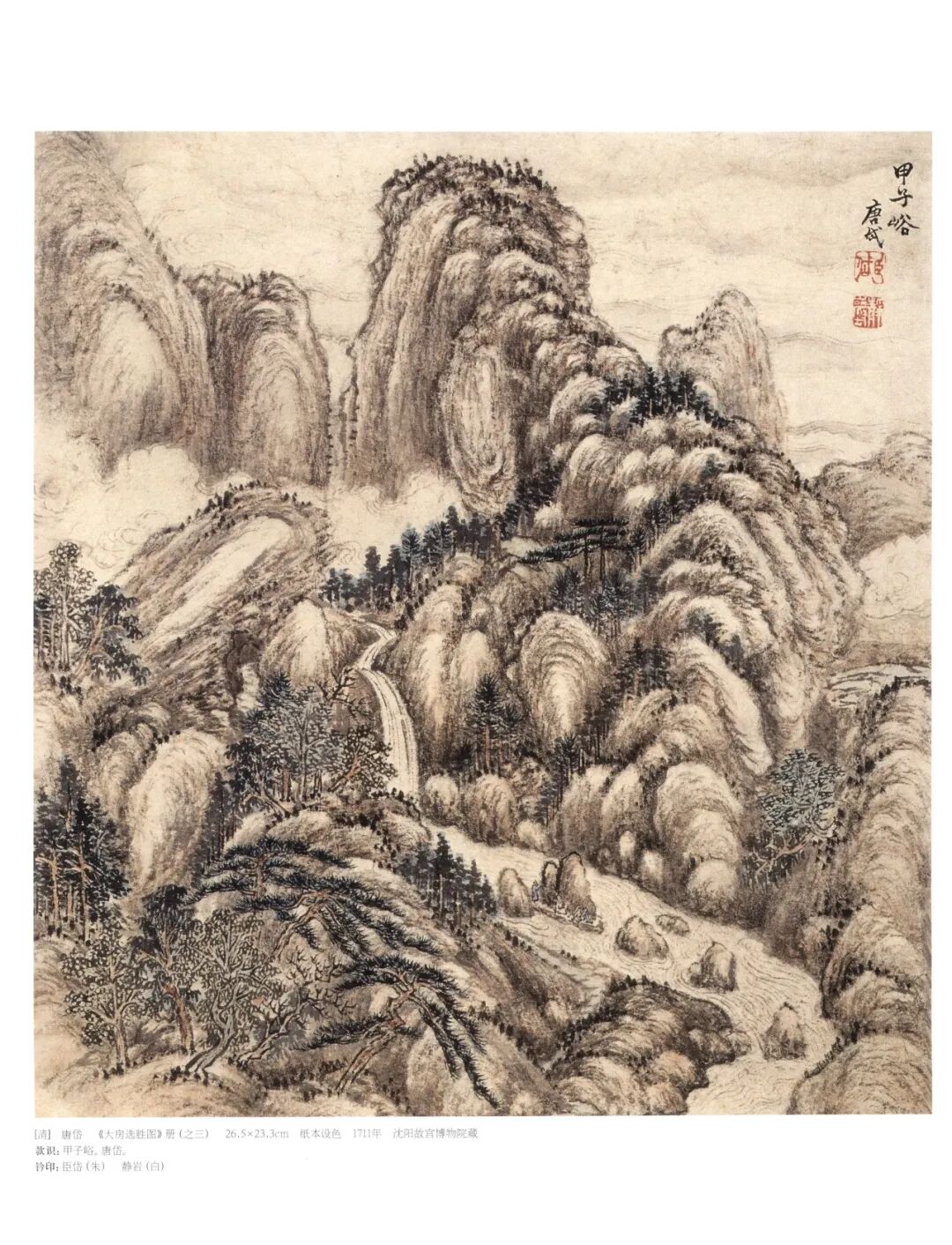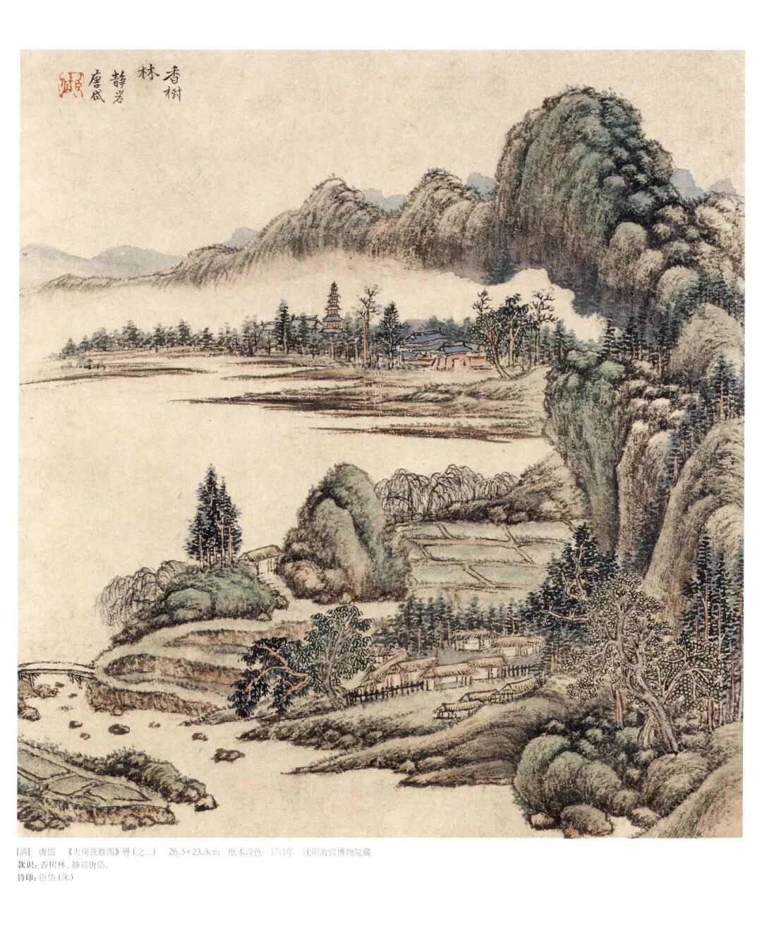 唐岱,字毓东,号静岩,是清中期杰出的满族画家,深受康熙、雍正、乾隆三朝皇帝赏识。他出生于勋臣世家,祖籍辽东,自幼酷爱绘画,技艺精湛,名动京师。康熙帝曾在其《千山落照图》上题写“我爱唐生画,屡索意未已”,并赐予他“画状元”的美誉,可见其画艺之高超。《大房选胜图》是唐岱三十八岁时的力作,用色浅淡,用笔清雅,与其另一代表作《圆明园四十景图》的工笔重彩形成鲜明对比,属于画家的自娱之作,更显其艺术本色。