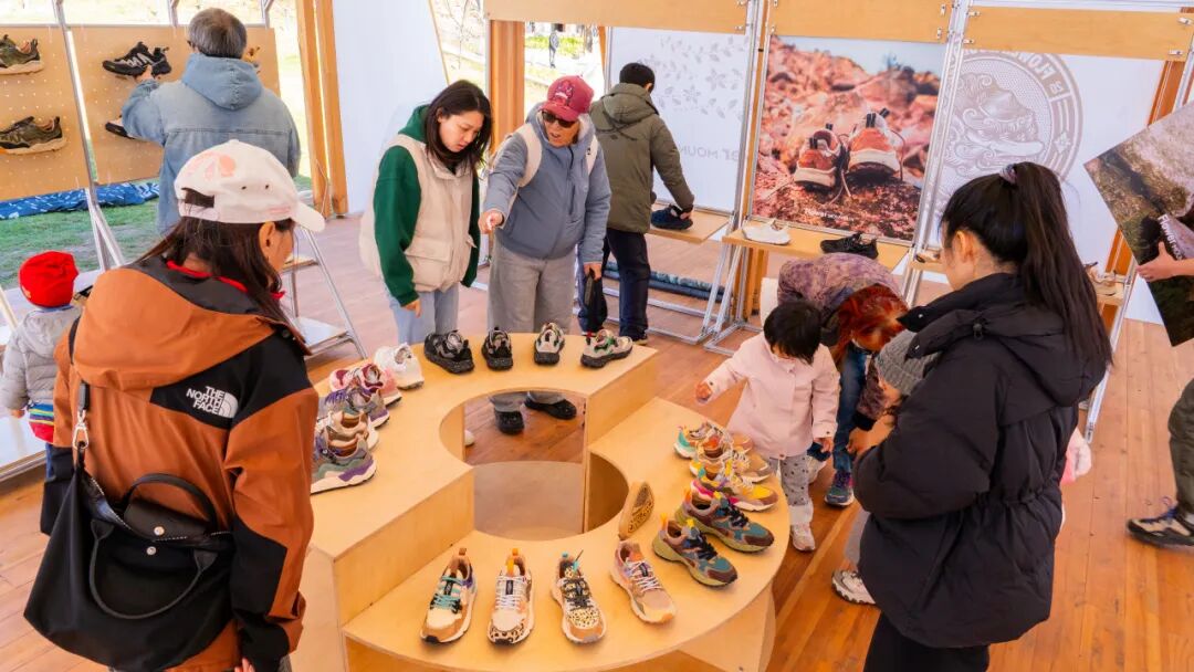 山雾花野(Flower Mountain)的自然美学展位前,联名鞋款的山野质感挺括有型,人们举着相机定格这份松弛,闲聊声、赞叹声与远处传来的欢笑声交织成网。