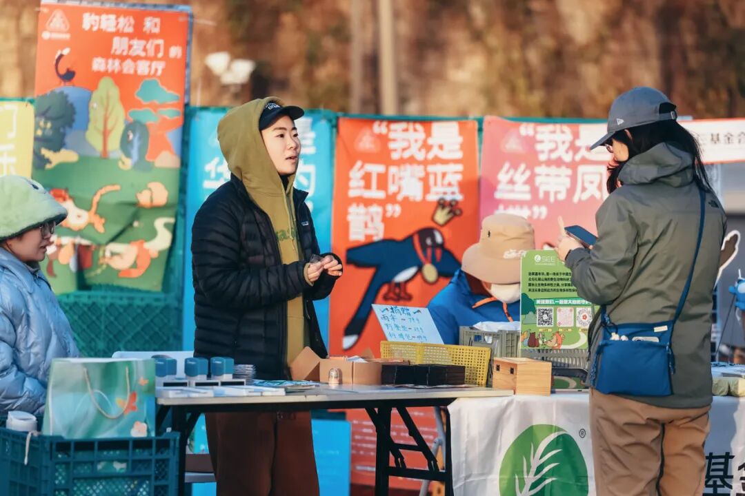 Snow peak(首钢园店)的营地旁,环保理念在轻声交谈中传递;阿拉善SEE的展位前,鲜艳海报展示着地球上的各种可爱生物,让我们共享自然之美,共筑美好家园。