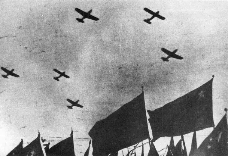 飞机都到了指定的集合点。机群等待命令进入北京上空。小队的机群安详地转着圈儿。驱逐机在我们的旁边和上空飞腾而过。四点二十分指挥部发出前进的命令,两架绿色飞机从我们的左上角掠过,我们紧紧跟着,沿铁路西进。机上每一个人的神经都紧张起来,摄影的同志对准镜头,等待着伟大的场面。四点三十分,北京出现在我们眼前。琉璃瓦的宫殿,红色的墙门,整齐的街道,这庄严的人民首都,今天被红色的旗帜所掩盖,愈加显得庄严美丽了。摄影机响了,天安门出现在机翼下面,数不清的红旗和黑压压的人群连成一片,地面的装甲部队正缓缓行进在司令台前。