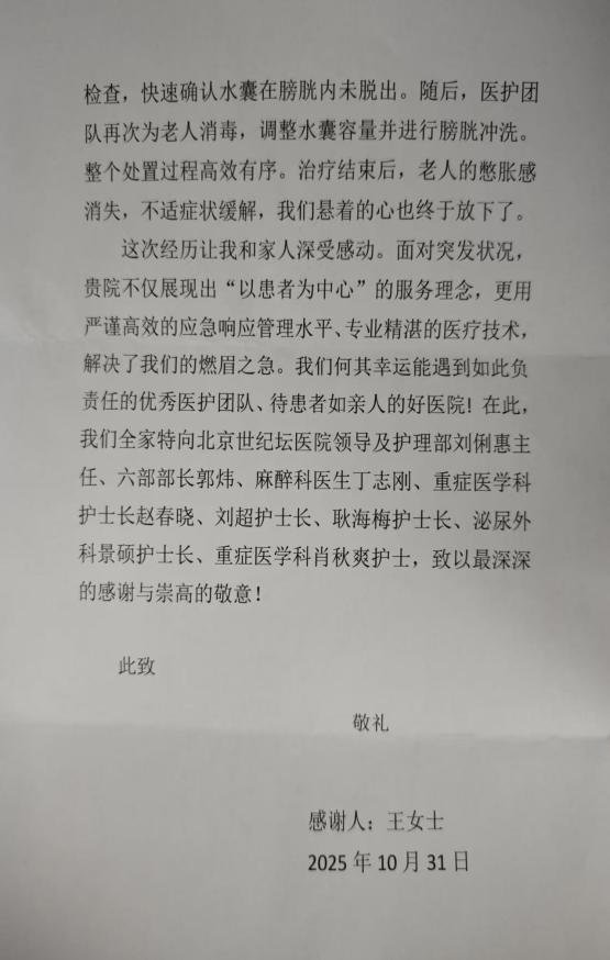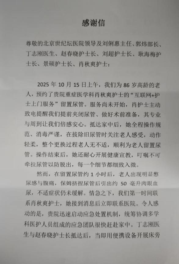 面面锦旗映初心,一纸感谢诉真情。近日,患者曹阿姨的家属专程来到首都医科大学附属北京世纪坛医院,将三面锦旗和三封感谢信送到护理部、重症医学科、麻醉科等科室的医护人员手中。这背后是一段跨越医院与家门的紧急救援故事,缘起2025年10月15日的一次“互联网+护理服务”。