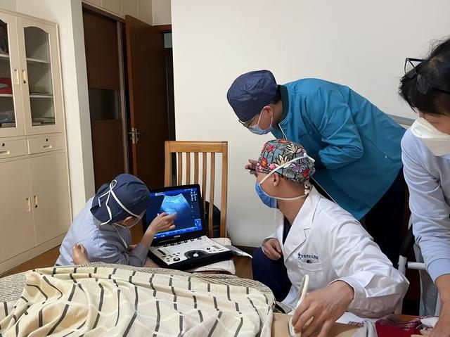 不料,留置尿管约1小时后,家属紧急来电告知:患者出现憋尿感且引出肉眼血尿。肖秋爽护士凭借丰富经验,一边指导家属预约治疗,一边立即上报护理部。护理部主任刘俐惠接到汇报后,即刻启动应急处置,组织泌尿外科护士长景硕等护理骨干复盘事件,迅速派出由六部部护士长郭炜、麻醉科医生丁志刚、重症医学科护士长赵春晓组成的护理超声小组,携设备赶赴患者家中开展床旁超声检查。