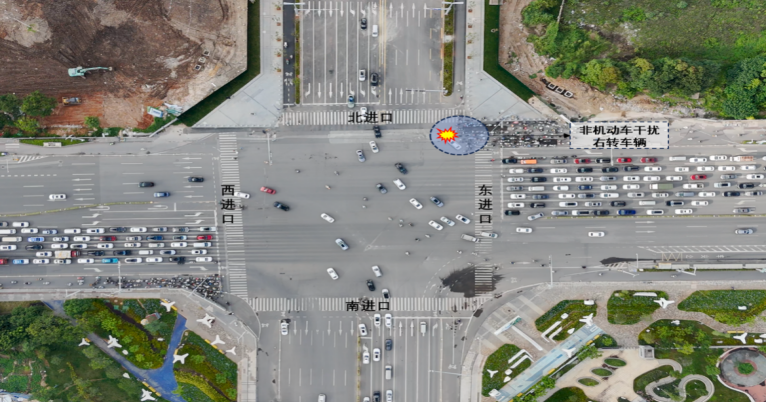 2.左转、右转车辆无导向线,交叉口内非机动车辆较多,存在安全隐患;