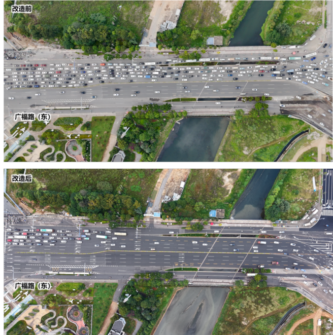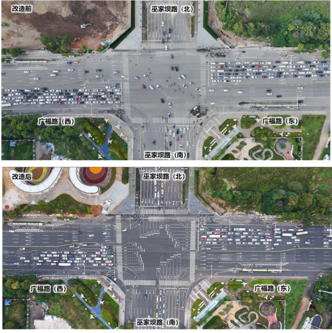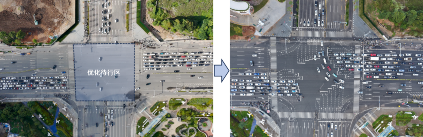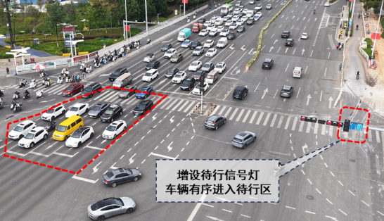 增加左转和直行待行区,充分利用交叉口空间,提高每个信号周期的车辆通行量,减少排队长度。大家记得根据信号灯提示进入待行区哦!