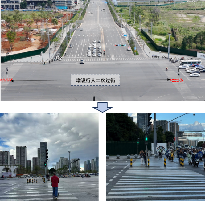 增加了二次过街设施,过马路更安全。行人朋友们请注意观察信号灯,分段过街更安全。