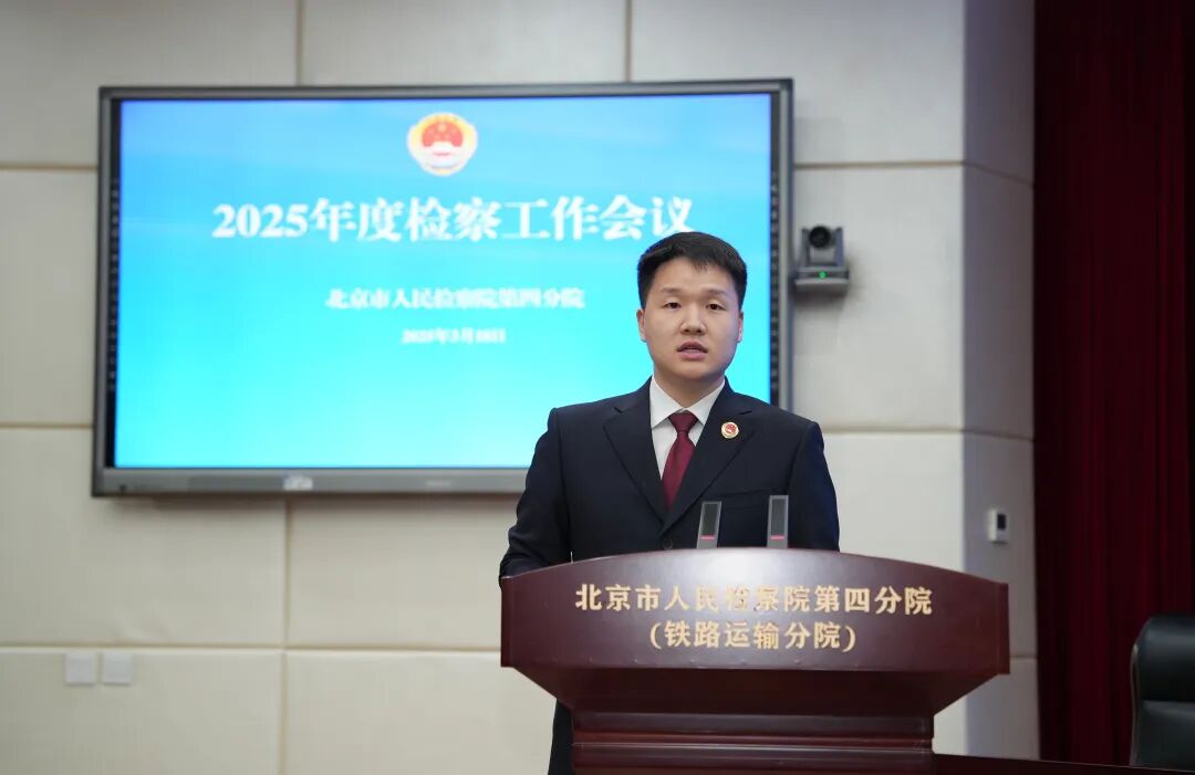 图为张亚峰作为部门干警代表在市检四分院2025年检察工作会议上作交流发言