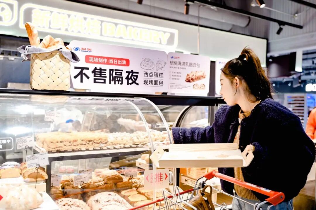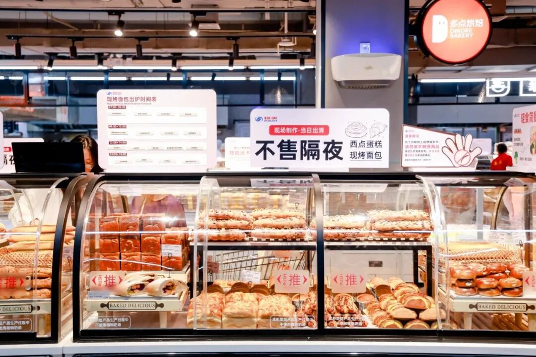 烘焙区同样主打“现制现售”,金黄的牛角包、扎实的全麦面包、果料丰富的蔓越莓吐司琳琅满目,刚出炉的丹麦酥层层起酥,奶香四溢。在这里,还可以随意免费品尝肉蛋堡、香辣牛肉干、核桃满满面包等特色商品,直观的体验直接拉动了大家的尝鲜欲和购物欲哦。